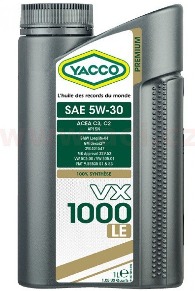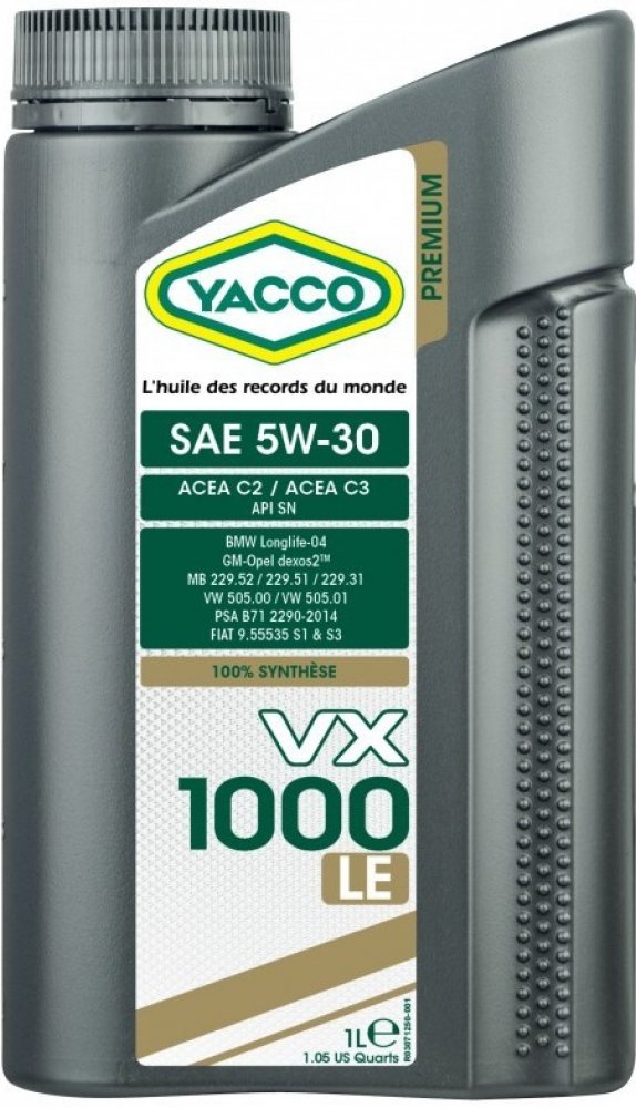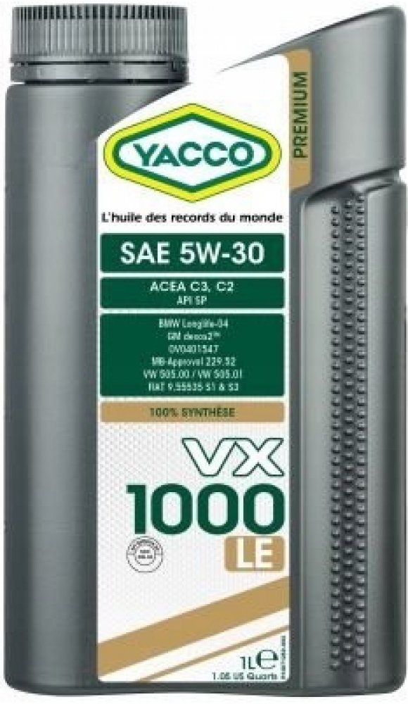 Yacco VX 1000 LE 5W30 - Plně syntetický motorový olej pro moderní osobní a lehké dodávkové automobily.Pokrývá širokou škálu OEM specifikací olejů.Doporučený olej pro naftové a benzínové motory Euro 4, Euro 5 nebo Euro 6 (včetně těch, které jsou vybaveny filtrem pevných částic), které vyžadují níže uvedené specifikace.YACCO VX 1000 LE 5W30 je vhodný motorů mnoha výrobců: BMW, Fiat, GM, Honda, Hyundai ,Kia, Mercedes, Mitsubishi, Nissan, Opel, P.S.A., Subaru, Suzuki, Ssangyong , Toyota, VW Group…