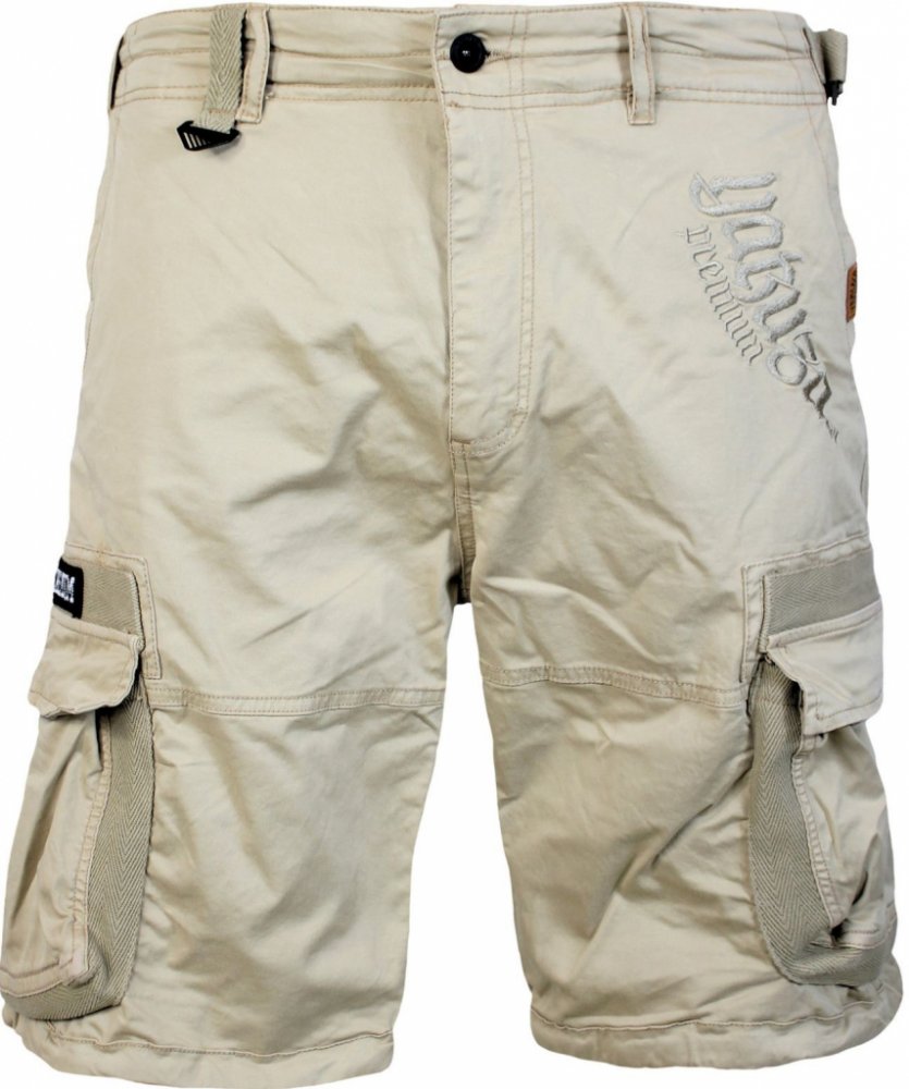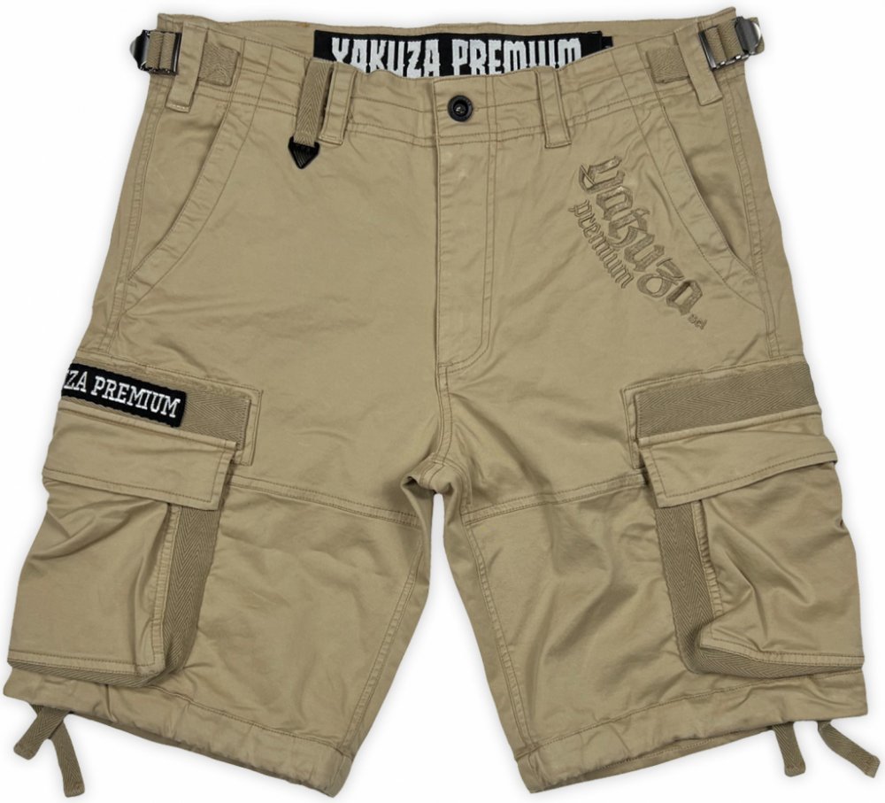 Cargo kraťasy YPCS 3655 v barvě Hell Sand (pískové) od Yakuza Premium Selection z kolekce léto 2024. Kraťasy mají černo/bílou nášivku Yakuza Premium Selection na pravé boční cargo kapse a vyšívaný nápis Yakuza Premium ve žluté (pískové) barvě u levé kapsy. Na zadní straně jsou dvě uzavíratelné kapsy. Krátké letní kalhoty mají dvě boční kapsy, normální střih a dvě šňůrky pro nastavení šířky. Opravd...