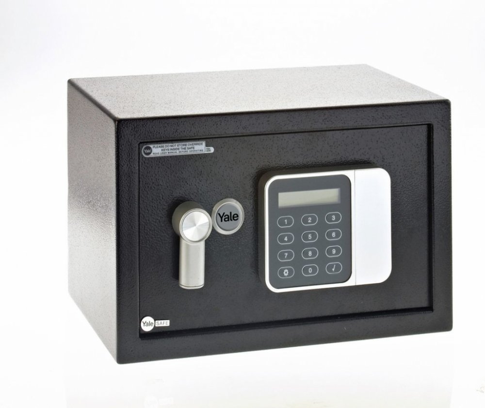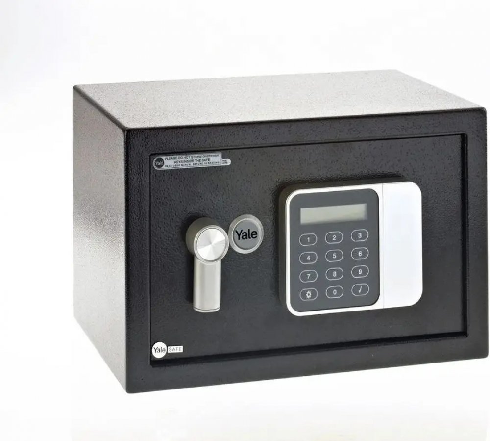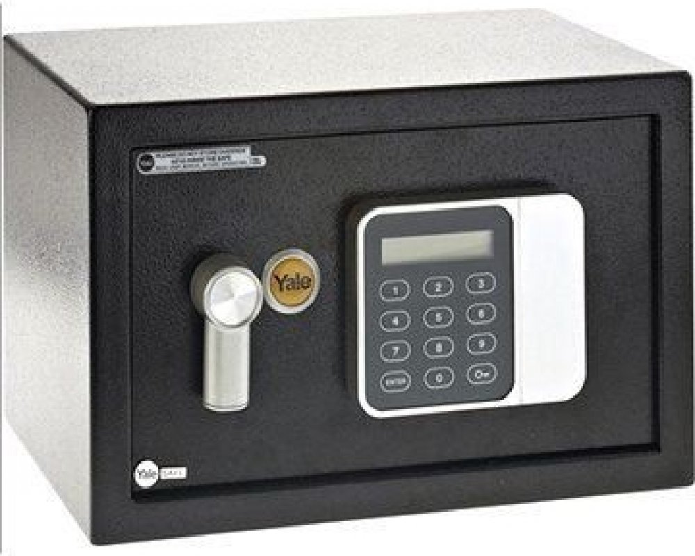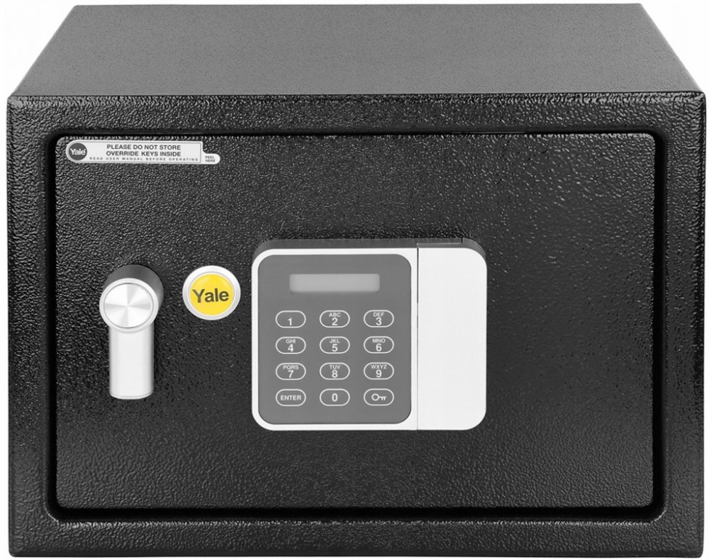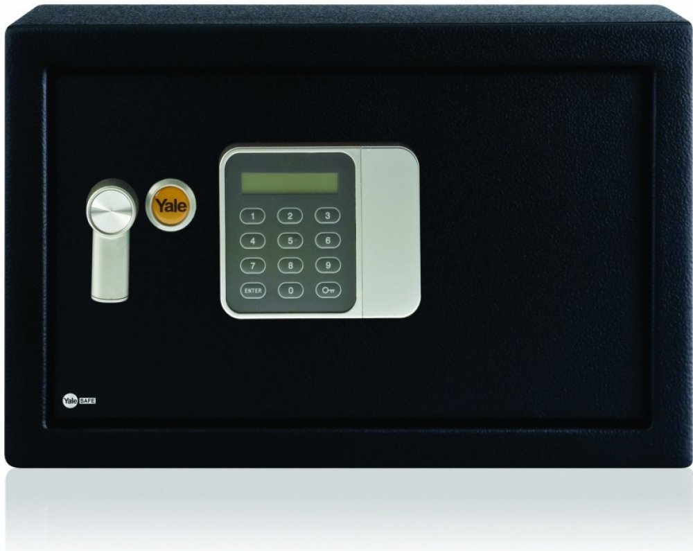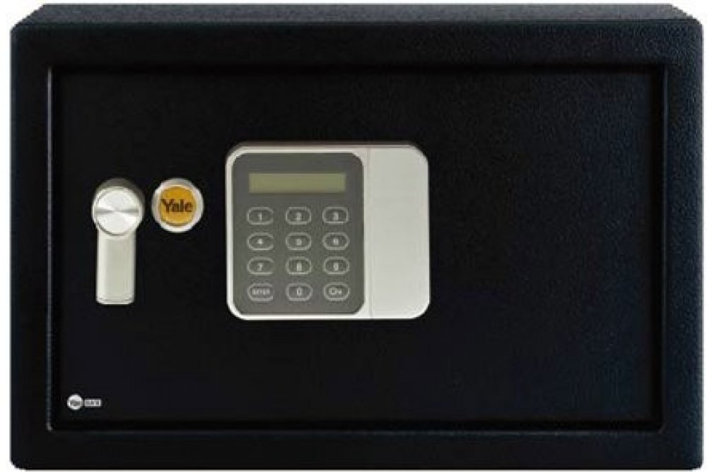 Trezor Guest Medium YSG/250/DB1 od značky Yale je vhodný především do hotelových pokojů či k dočasnému uschování cenných předmětů. V jeho přední části se nachází LCD displej zobrazující zadávaný 3–6místný číselný kód, který si můžete libovolně zvolit podle sebe. Po třech chybně zadaných pokusech se trezor samovolně na pět minut uzamkne. Trezor však můžete také ovládat dvěma dodávanými klíči, klíčový otvor je pak uschovaný za logem značky Yale. Zadávání kódu i otevření trezoru lze v případě potřeby navolit v tichém módu. Baterie se vkládají do trezoru z vnější strany, bez nutnosti odemčení trezoru pro jejich výměnu.