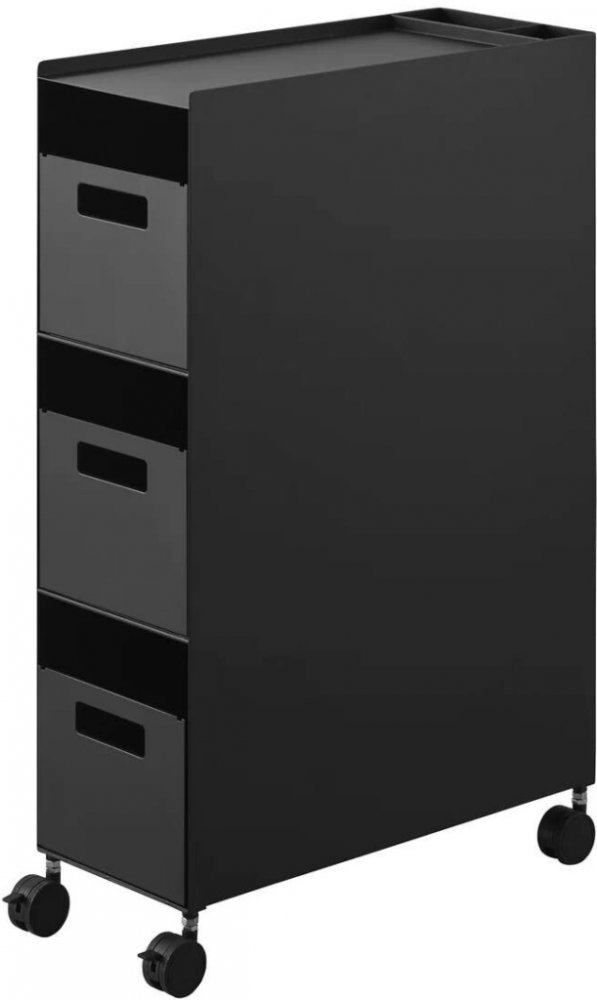 Všestranný pojízdný úložný vozík se třemi koši YAMAZAKI Tower 10015 (bílý) / 10016 (černý). Vozík nabízí tři úrovně úložného prostoru se třemi koši vybavenými flexibilními přepážkami. Další úložný prostor je k dispozici ve dvou zadních přihrádkách.