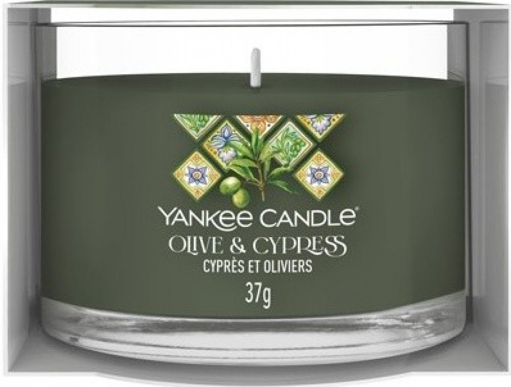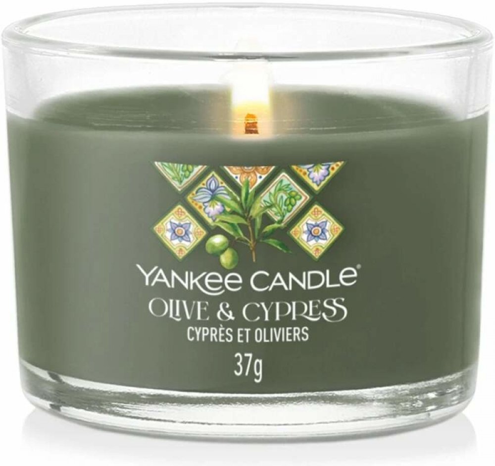 Malá votivní svíčka ve skle od značky Yankee Candle s nádhernou vůní oliv a cypřiše je skvělý způsob jak vůni vyzkoušet, tip na drobný dárek nebo společník na cestách.