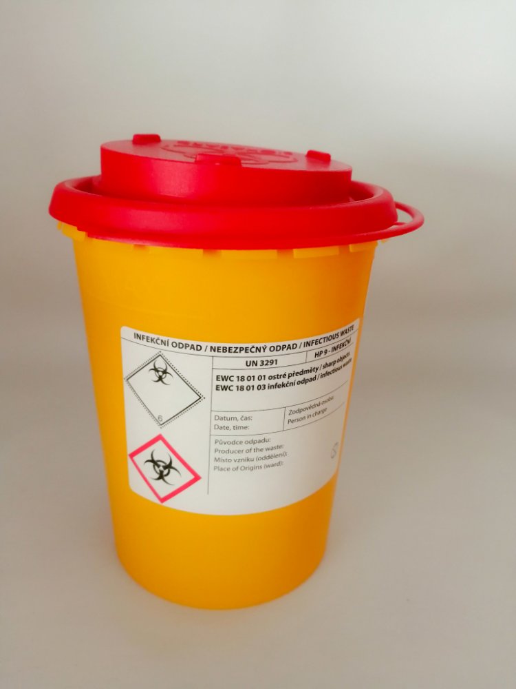 Nádoby jsou určeny k jednorázovému použití pro sběr nebezpečného klinického odpadu v místě jeho vzniku. Nádoby splňují podmínky vyhlášky 306/2012 Sb. ,kterou se upravují podmínky předcházení vzniku a šíření infekčních onemocnění a hygienické požadavky na provoz zdravotnických zařízení a ústavů sociální péče dle zákona 258/2000 Sb. v platném znění. Nádoby jsou spalitelné včetně obsahu ve specializo...