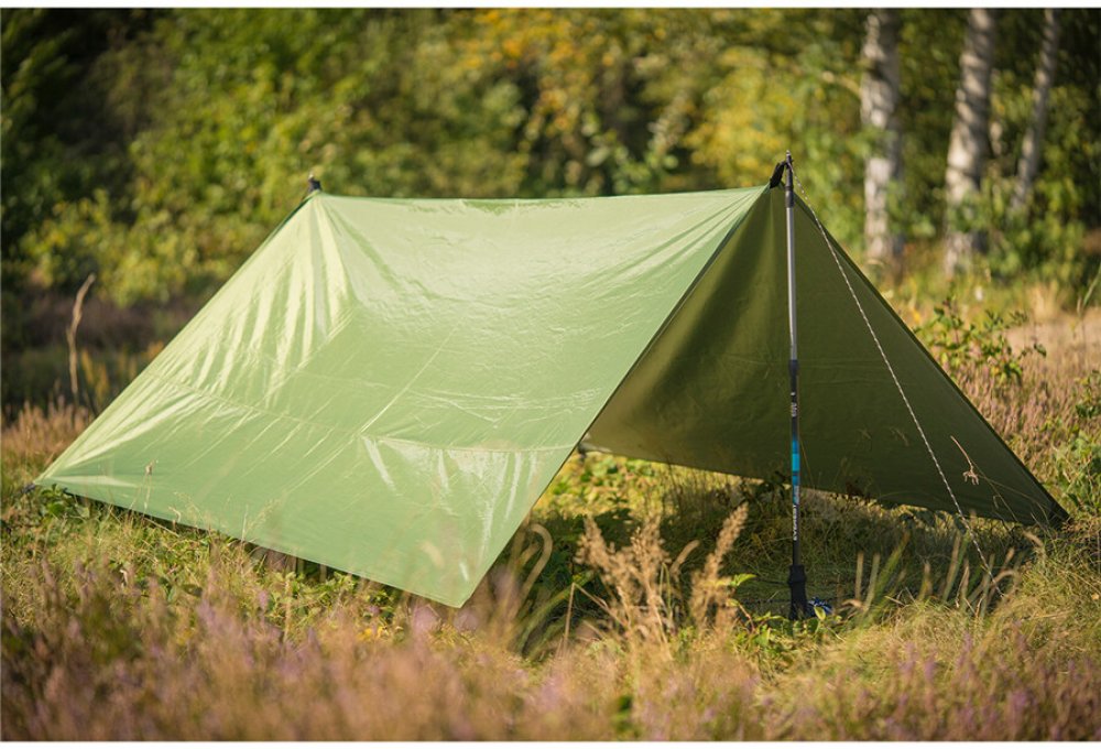 Pevná a odolná bivakovací plachta pro zvýšení ochrany při nocování venku. Voděodolná plachta, kterou lze natáhnout přes šňůru nebo napnout na tyčky. Zesílené švy okolo háčků, očka, spínací druky pro spojení více plachet.