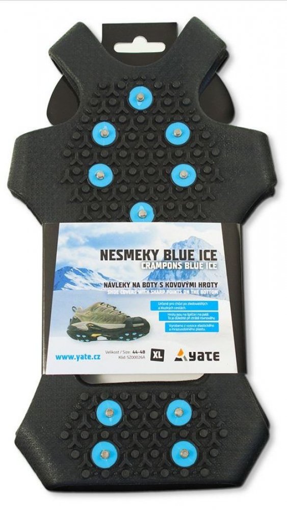 Nesmeky YATE BLUE ICE jsou určeny pro chůzi na sněhu, ledovém nebo kluzkém terénu. Zlepšují stabilitu a trakci na plochém nebo mírně nakloněném podkladu. Velmi rychle a jednoduše se nasazují na boty. Model BLUE ICE má vylepšené usazení hrotů, které zamezuje jejich náhodnému vypadnutí. Nesmeky nejsou vhodné pro horolezectví. Vyrobeno z vysoce elastického a mrazuvzdorného plastu.