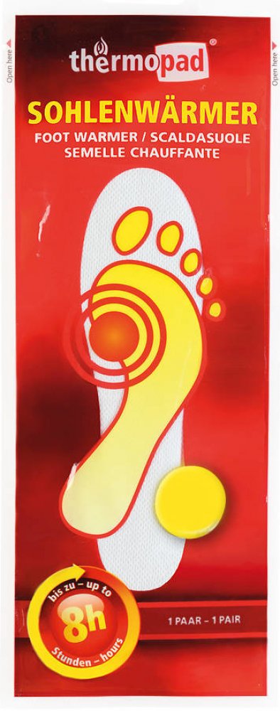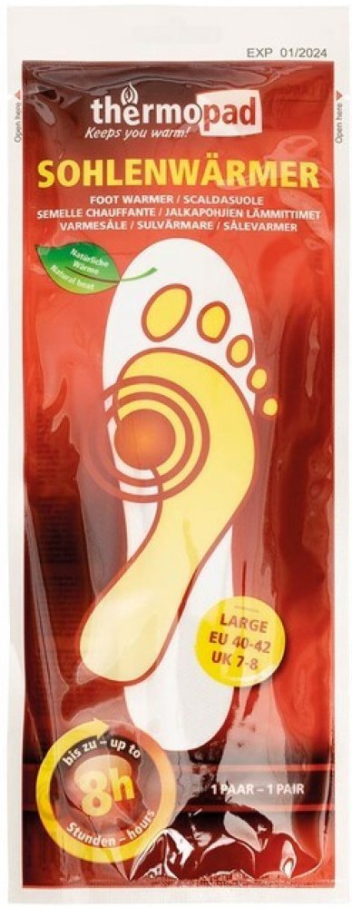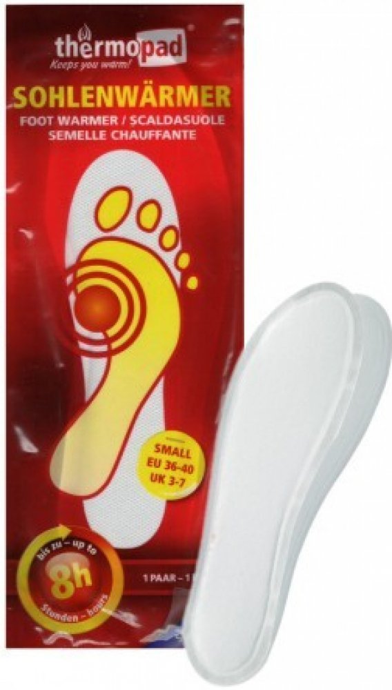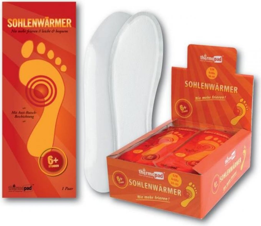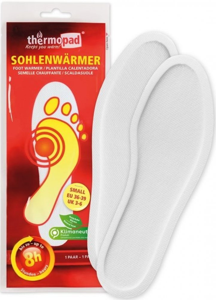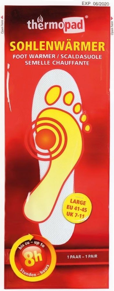 Ohřívač chodidel Thermopad L/XL od firmy Yate poslouží k prohřátí chodidel v náročném počasí. Zabrání tak prochladnutí nebo případným úrazům. Ohřívač chodidel Thermopad L/XL vyrobený firmou Yate primárně slouží k prohřátí chodidel v nevlídném počasí. Díky tomu uživatel předejde prochladnutí a případným úrazům. Ohřívač reaguje při kontaktu s kyslíkem, a proto jeho zahřátí chvíli trvá. Vydržet by měl 5 až 12 hodin (závisí na okolních podmínkách) a jeho použití je jednorázové. Velikost ohřívače je 41-45. Balení obsahuje vždy jeden pár. Vlastnosti ohřívače chodidel Thermopad L/XL: primární zahřátí chodidel v nevlídnem počasí velikosti 41-45 funguje 5 až 12 hodin (závisí na okolí) jednorázové použití prodáváno v párech