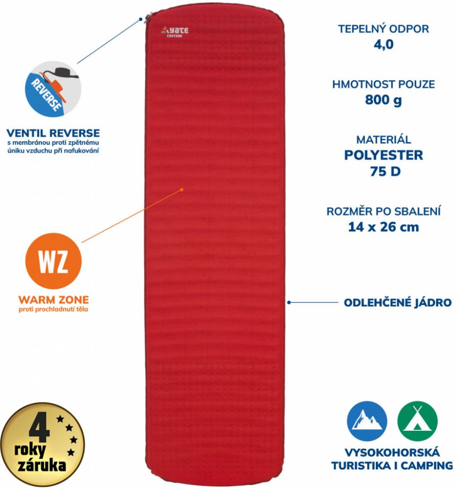 YATE CONTOUR má shodné parametry s modelem YATE TREKKER, ale má trochu jiný materiál povrchu se vzorem vrstevnice. Vyniká svou kvalitou materiálu a zpracováním. Povrch je polyester 75D, který je odolný a zabraňuje klouzání spacáku. Odlehčené jádro snižuje hmotnost výrobku. WARM ZONE - pod zády a boky je pěna odlehčená jen horizontálními kanálky a proto je zde více pěny pro zajištění dostatečné izo...
