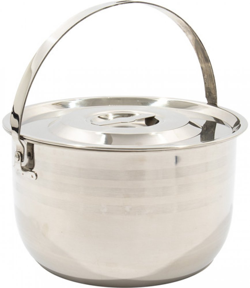 Kotlík s poklicí a sklopným uchem pro zavěšení nad oheň. Nerezová ocel je vysoce kvalitní materiál pro přípravu potravin. Je zdravotně nezávadná, odolná proti oděru a velmi jednoduše se udržuje i při velkém zašpinění kouřem z ohně. Ke kotlíku doporučujeme trojnožku (SN00165) která velmi usnadní vaření na ohništi.