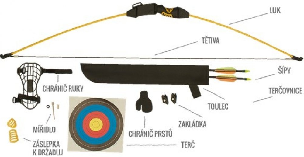 Lukostřelecký set - luk, 2 šípy a příslušenství, PE obal. Set pro lukostřelbu, neobsahuje terčovnici. Vhodný pro děti od šesti let.