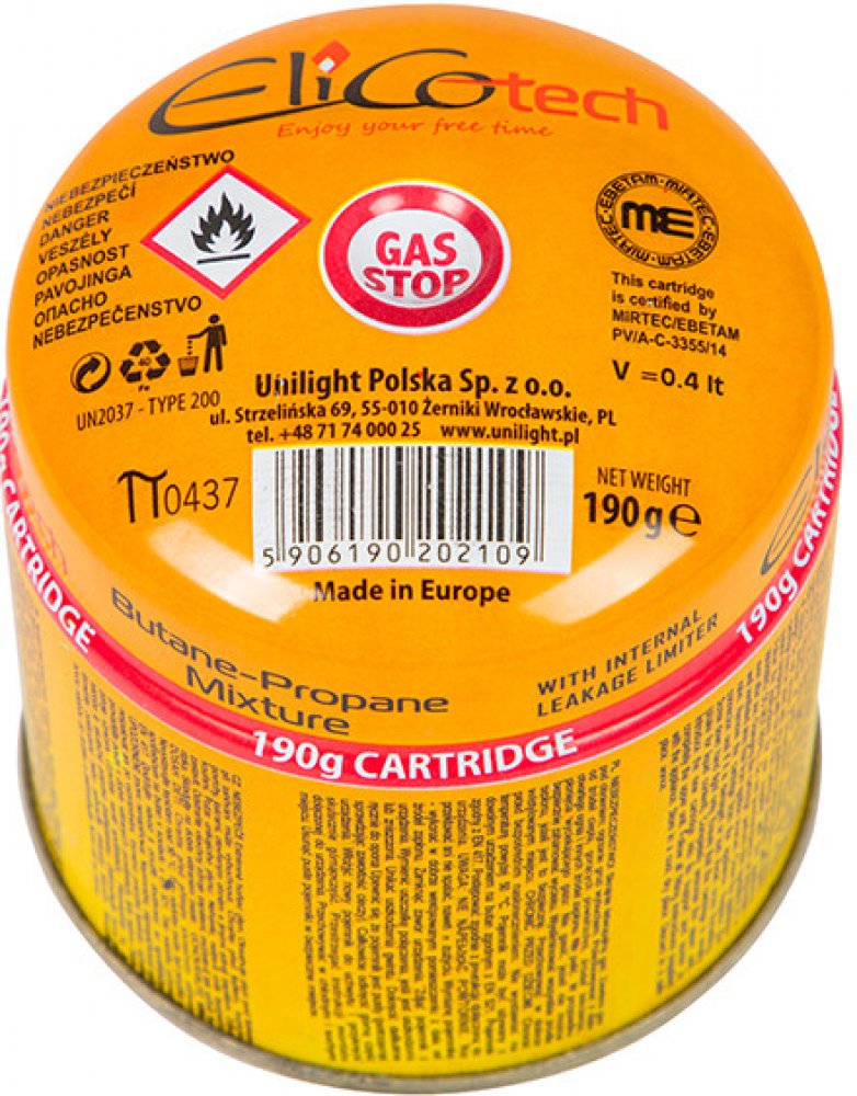 Kartuše propan/butan na jedno použití, vhodná pro vařiče STING K190 a pro všechny další spotřebiče na propichovací kartuše typ 200. Kartuše má bezpečnostní systém STOP-GAS, který zabraňuje úniku plynu. Hmotnost náplně 190 g.