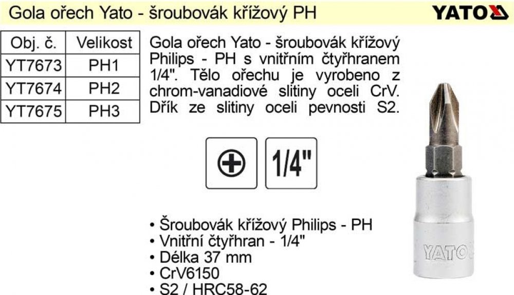 YT-04412 Dostupné: 2 ks Popis: Gola ořech Yato - šroubovák křížový Philips - PH2 s vnitřním čtyřhranem 1/4". Tělo ořechu je vyrobeno z chrom vanadiové slitiny oceli CrV. Dřík ze slitiny oceli pevnosti S2.• Šroubovák křížový Philips - PH2• 1/4"• Délka 37 mm• CrV6150• S2 / HRC58-62• Max kroutící moment 21,6 Nm