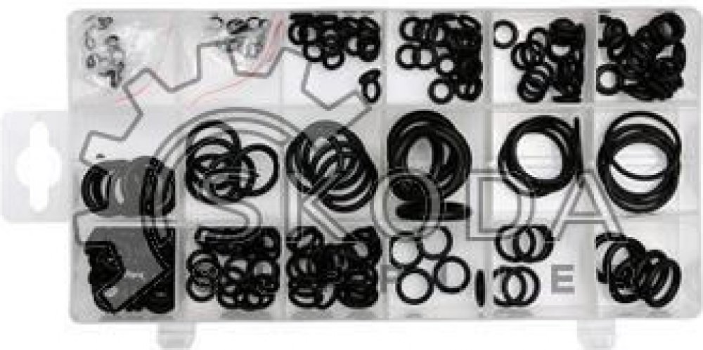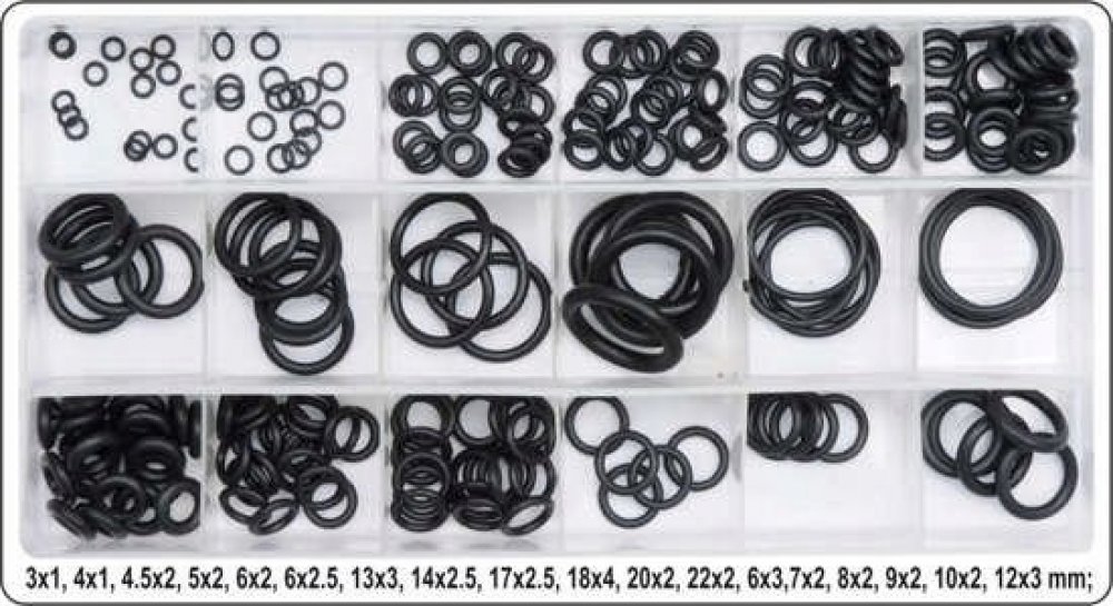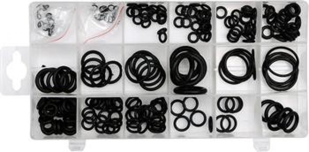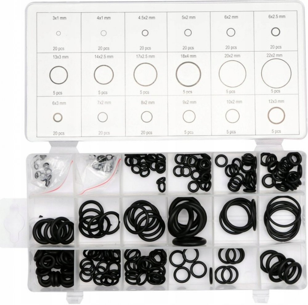 Sada 225 ks o-kroužků vyrobených z odolné gumy, odolávající oleji, palivu, chemikáliím a vysokým teplotám.