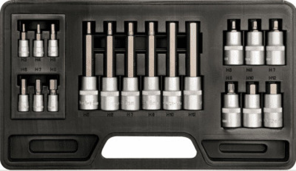Sada obsahuje: Hlavice imbus 1/4" délka 37 mm: H3 / 4 / 5 / 6 / 7 / 8 Hlavice imbus 1/2" délka 50 mm: H5 / 6 / 7 / 8 / 10 / 12 Hlavice imbus 1/2" délka 100 mm: H5 / 6 / 7 / 8 / 10 / 12