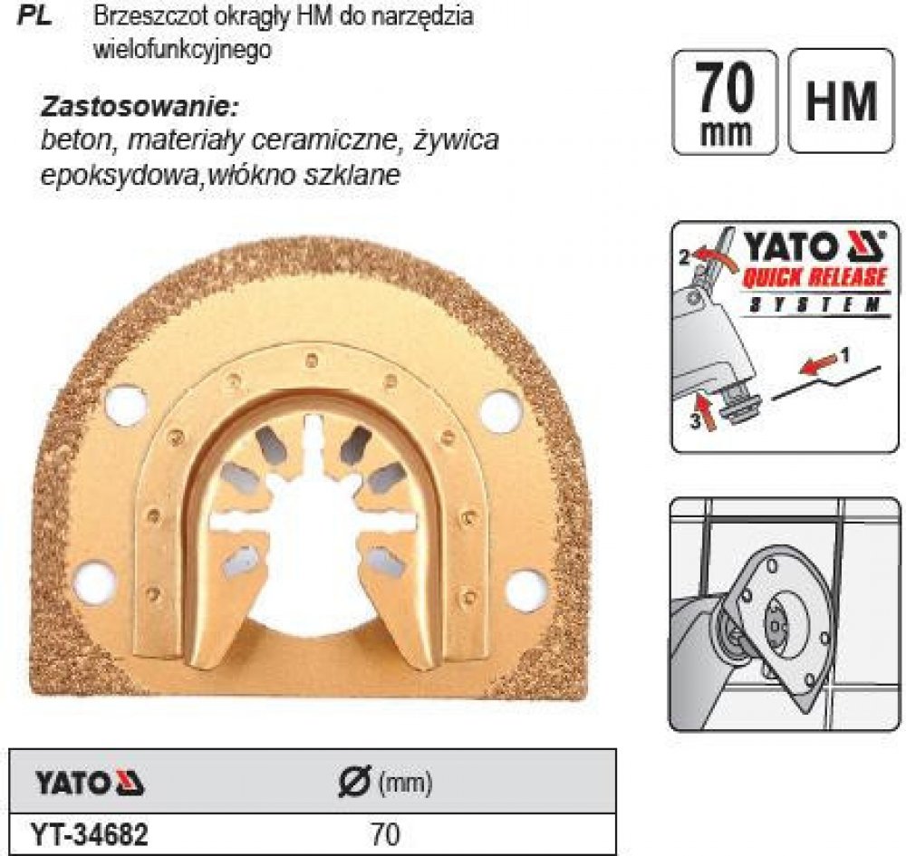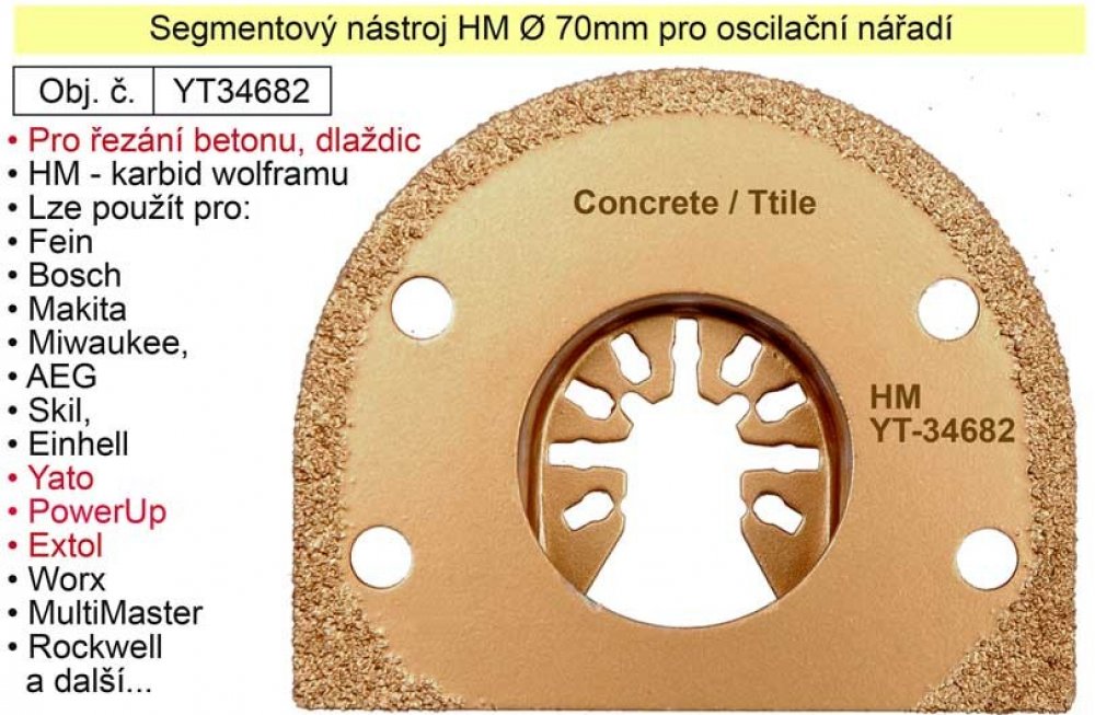 Segmentový řezací nástroj HM s nánosem karbidu wolframu s upínacím systémem OIS, pro řezání stavebních materiálů nař. dlažby, obklady, beton, zdivo. Upínání OIS, dovoluje tento nástroj použít v oscilačních přístrojích značek, jako například Fein, Bosch, Makita, Miwaukee, AEG, Skil, Einhell, Yato, PowerUp, Extol, Worx, Multi Master, Rockwell a mnoho dalších.