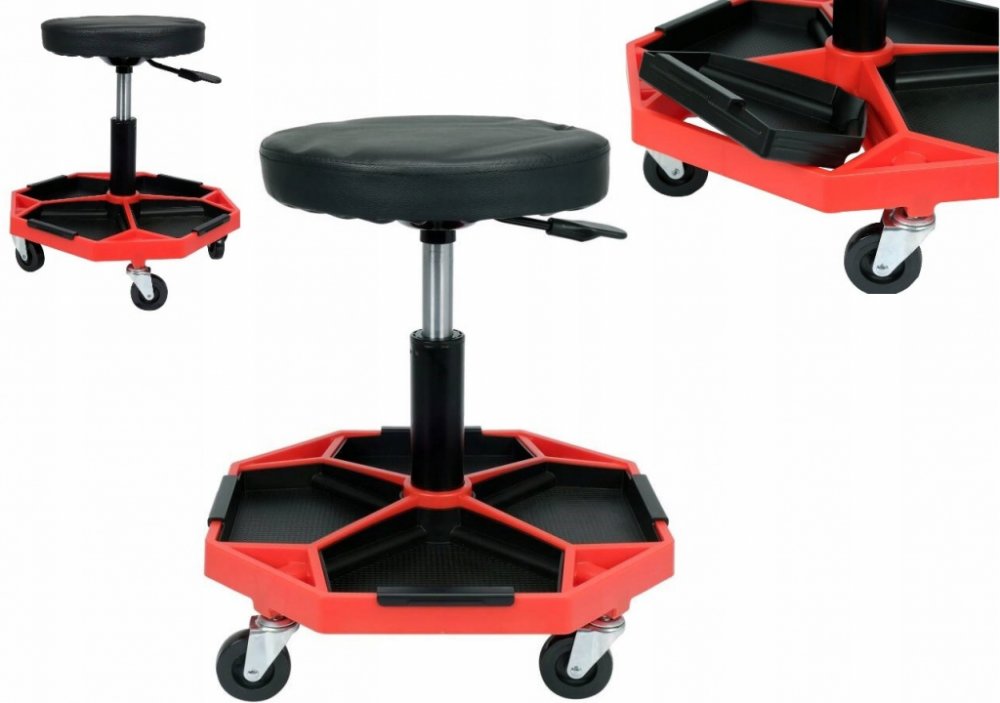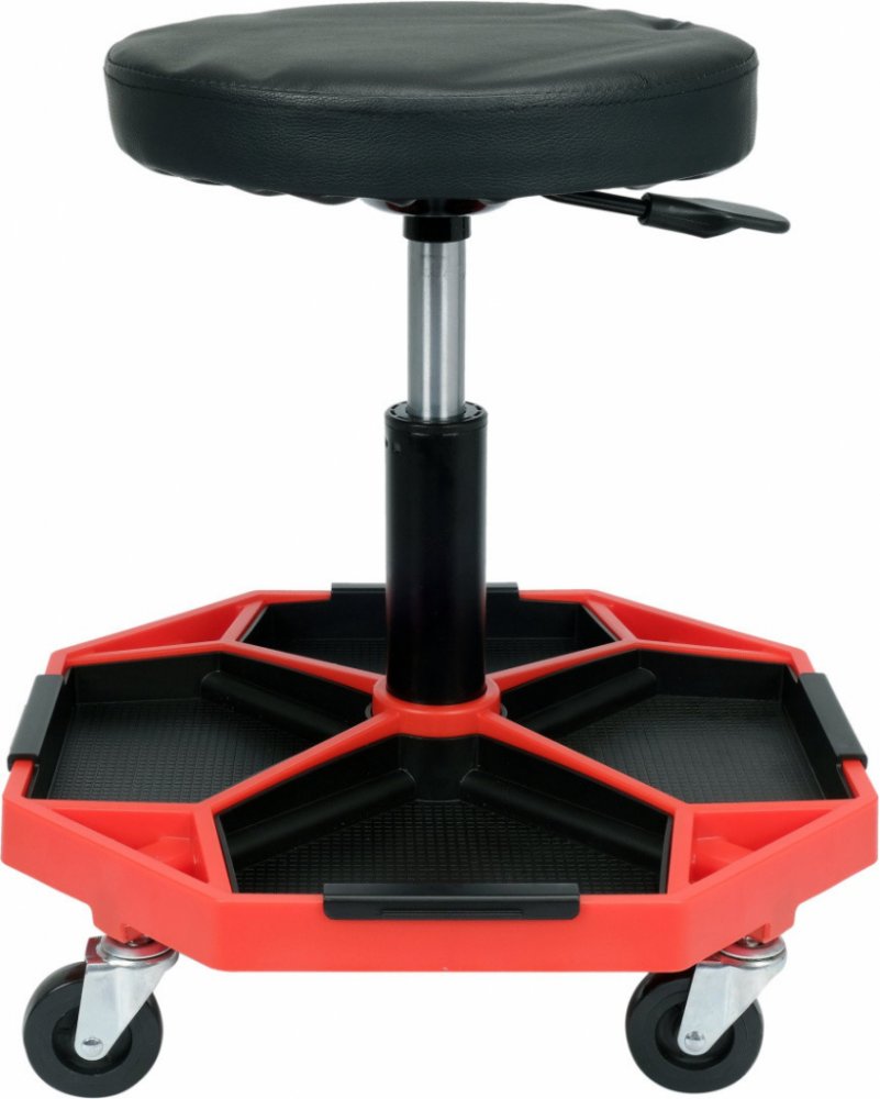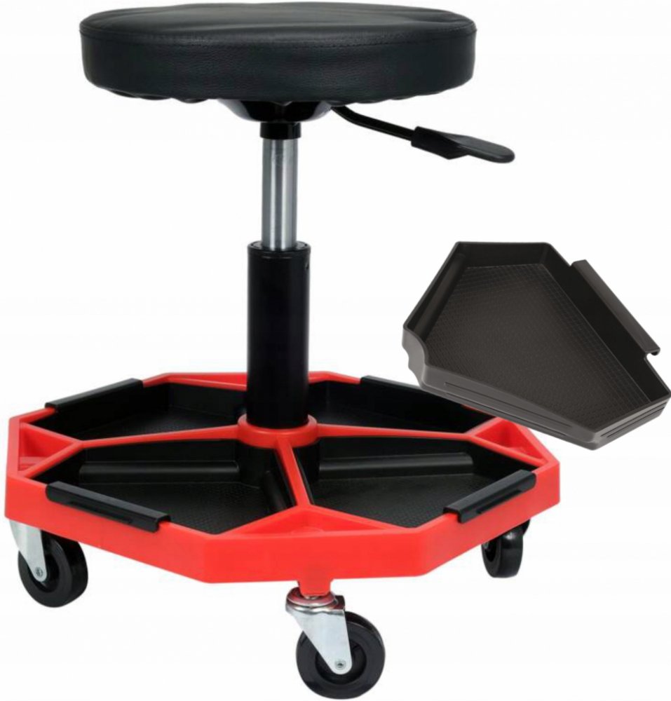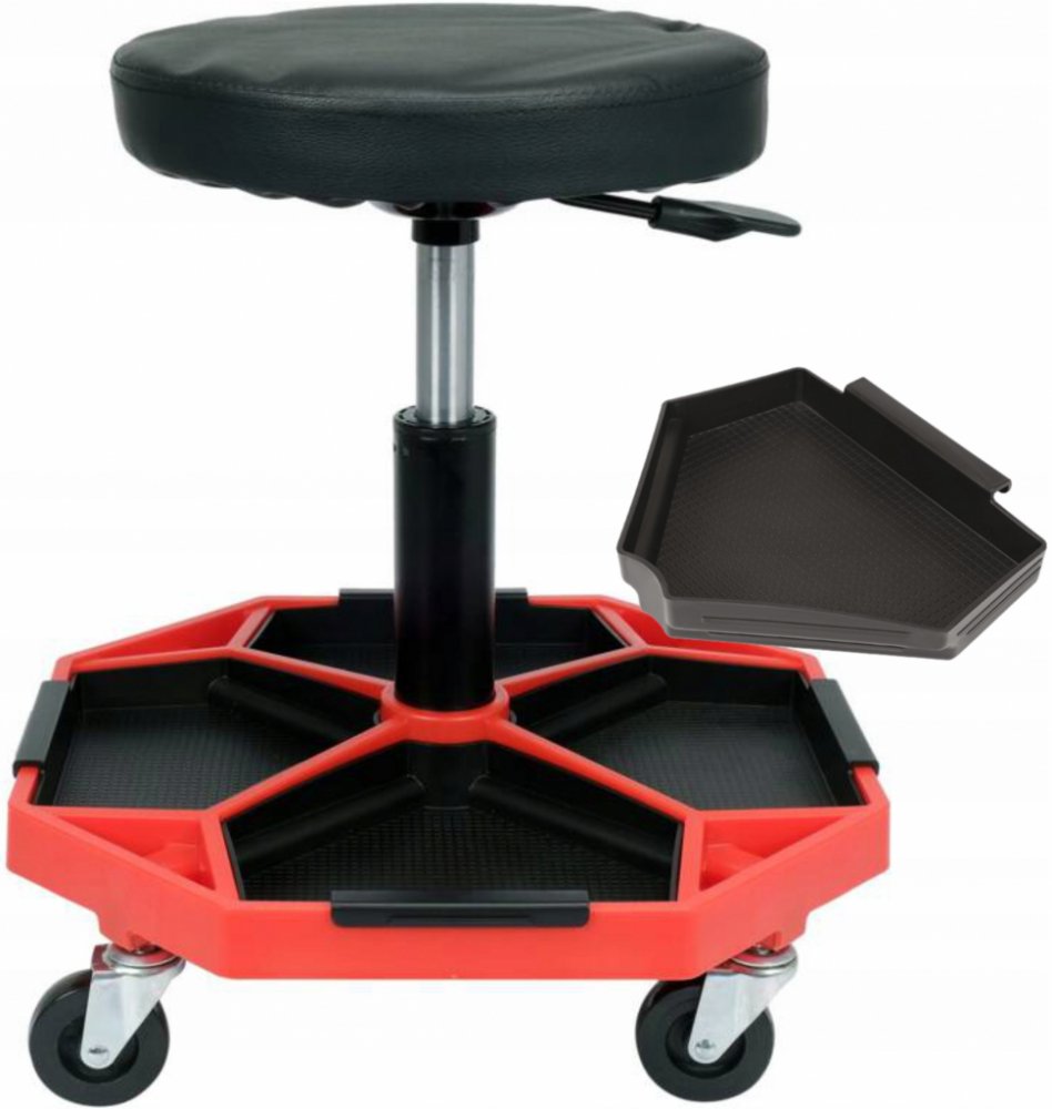 Otočné dílenské sedadlo s vložkami pro ukládání drobných předmětů.
