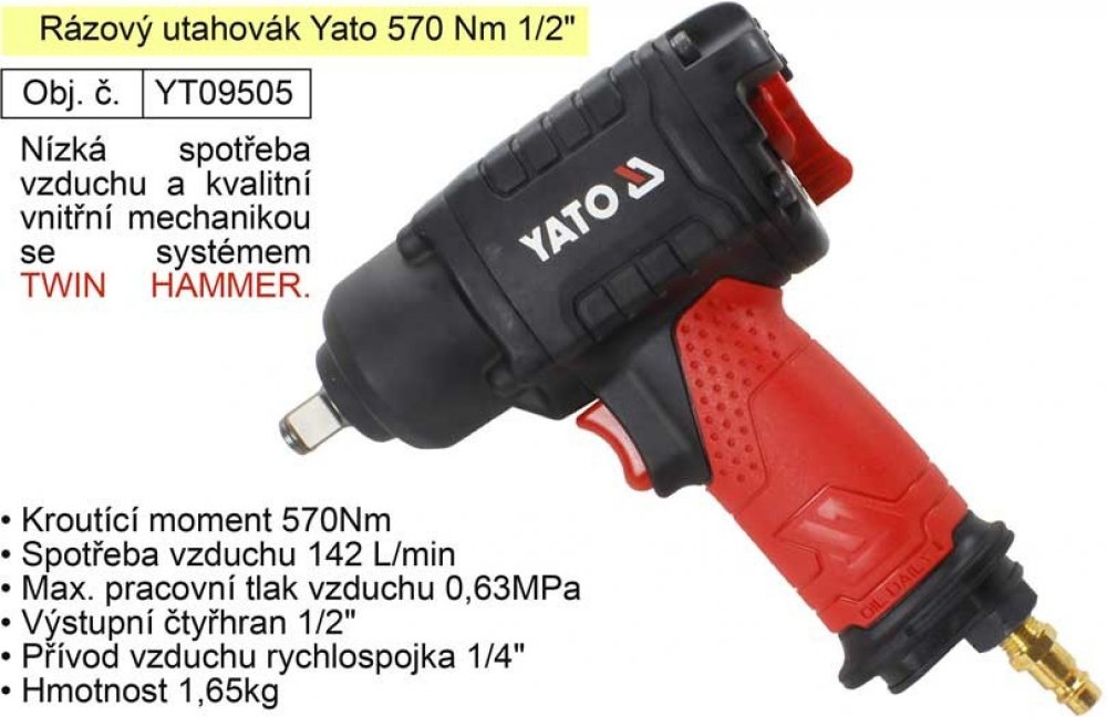 Rázový pneumatický utahovák Yato kroutícím momentem 570Nm, nízkou spotřebou vzduchu a kvalitní vnitřní mechanikou se systémem TWIN HAMMER.
