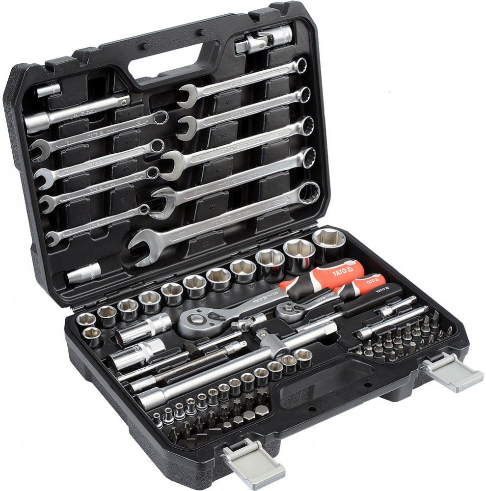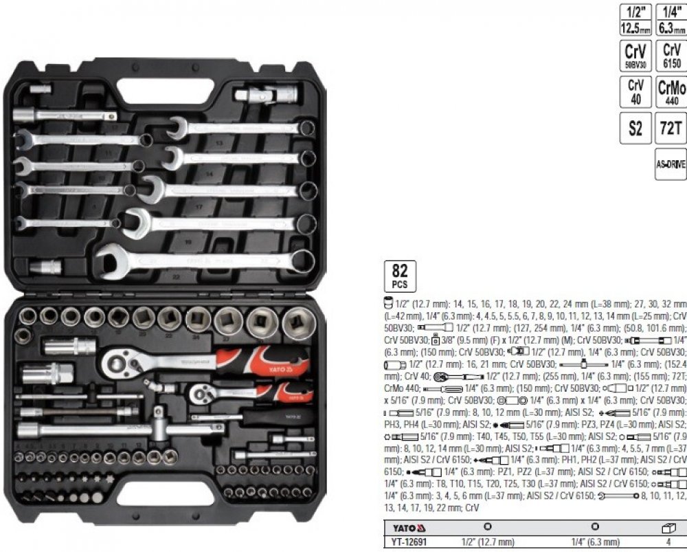 Gola sada 1/2" a 1/4" obsahuje 82ks: nástavců, prodlužovacích nástavců, ráčny s plastovou rukojetí, očkoploché klíče a další příslušenství. Vyrobené z kvalitní oceli CrV40, CrV6150, CrV50BV30, CrMo440 a S2 s funkcí AS-DRIVE. Ráčny mají jemný 72 zubý chod.