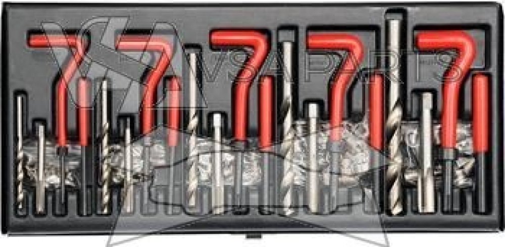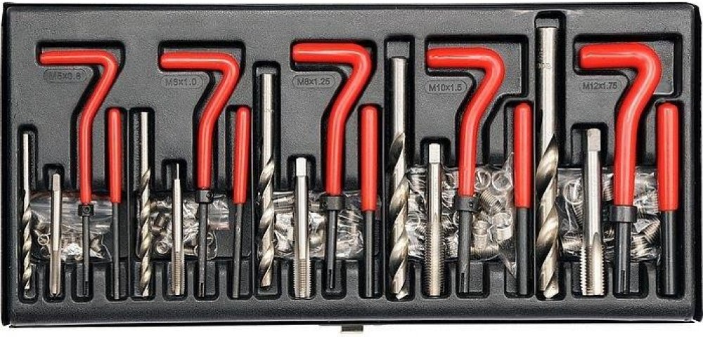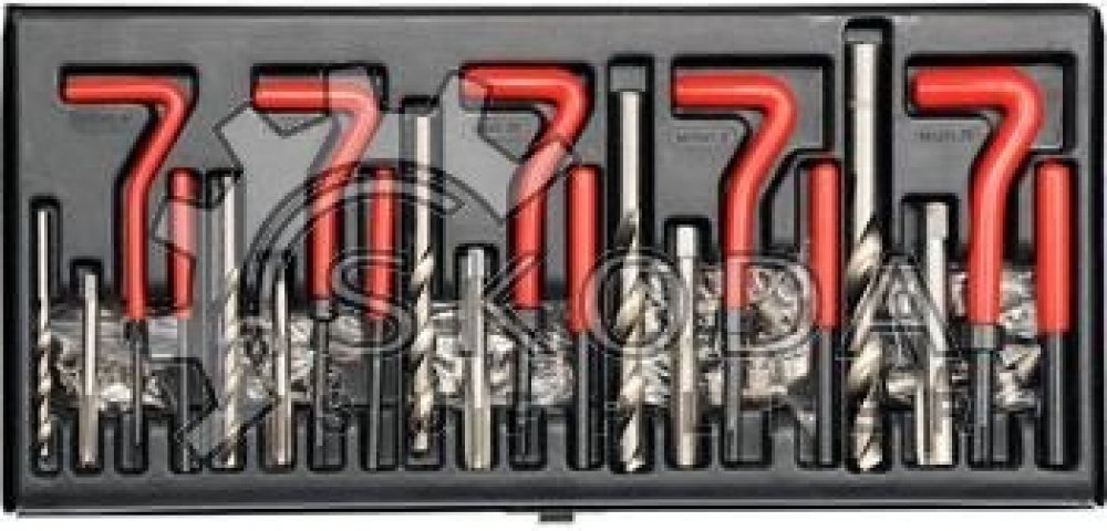 Opravná sada poškozených metrických závitů je určena všude tam, kde při poškození závitu nelze použít šroub jiného rozměru, než byl původní. Dále lze závitové vložky využít pro výztuhu závitů v materiálech s nízkou pevností ve střihu např. alu nebo hořčíkové slitiny. Obsahem sady pro každý druh závitu je vrták, závitník, zavádeč, vyrážecí trn a závitové vložky z nerezové oceli. Vložky M5 – M10 jso...