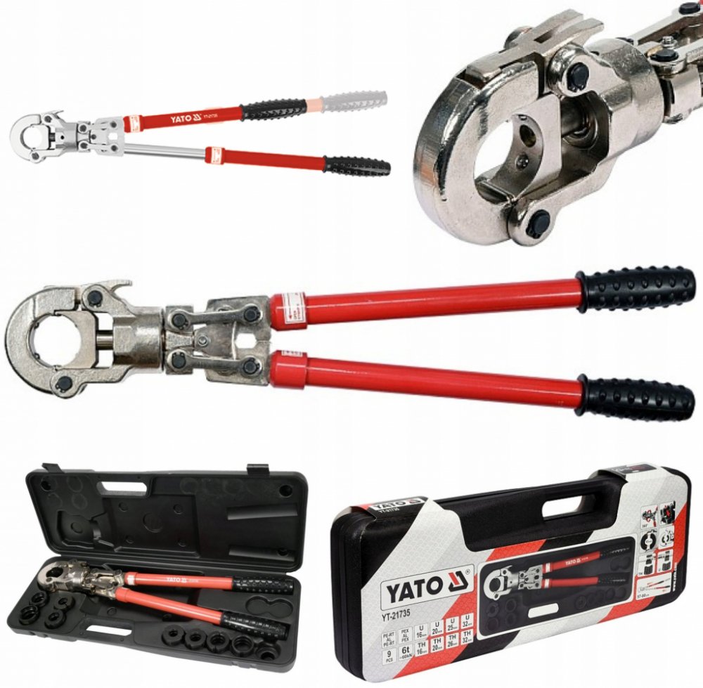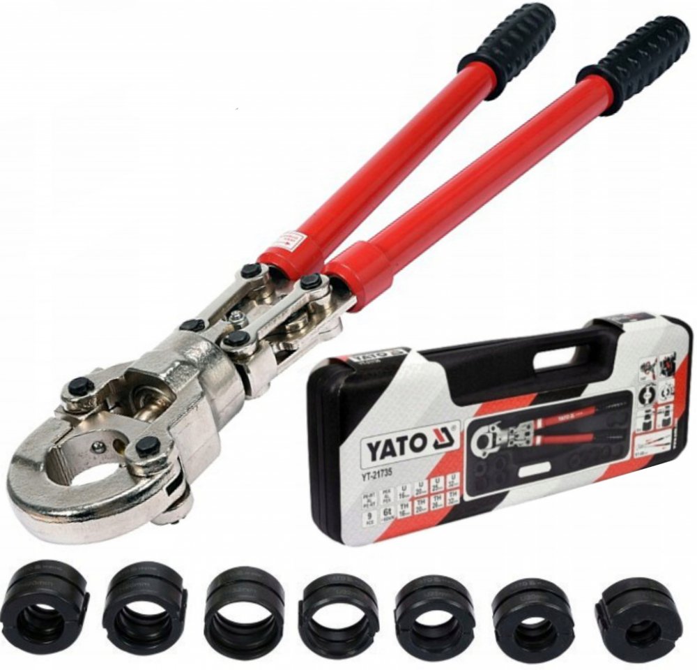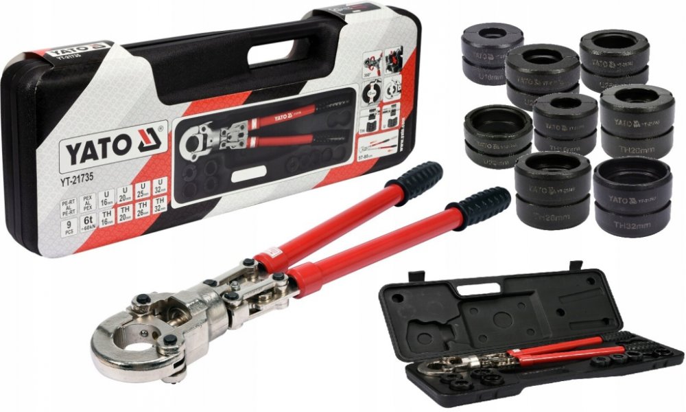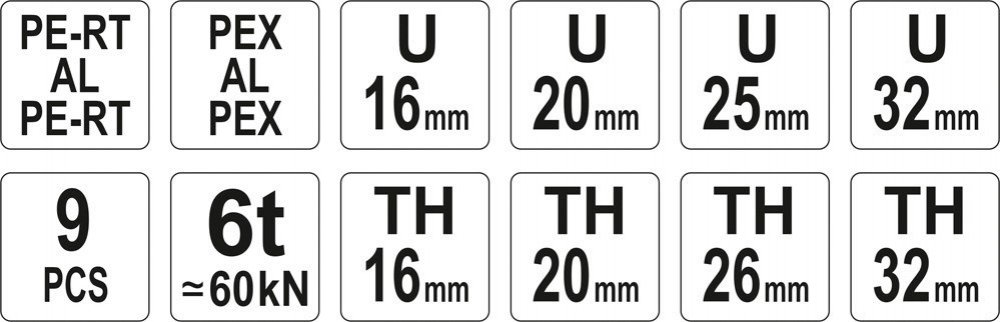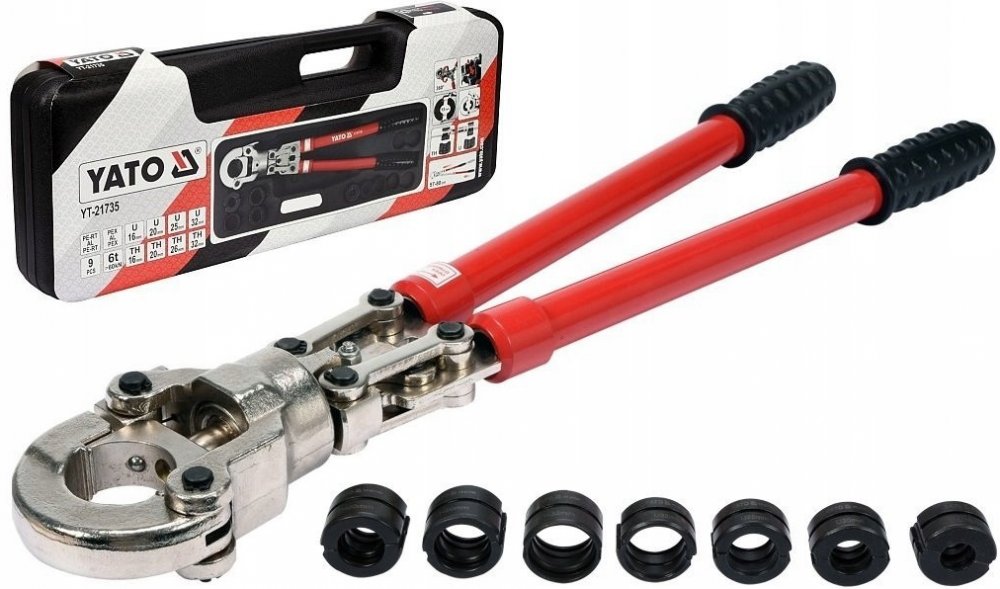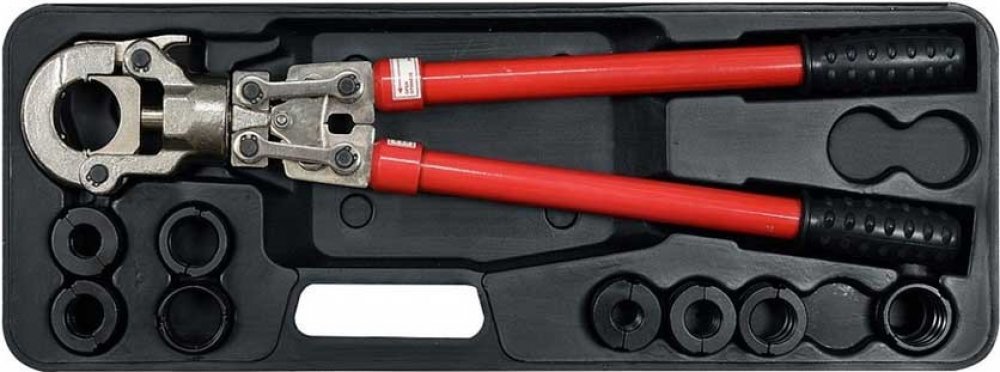 Lisovací kleště na plastové vodovodní potrubí PEX-AL-PEX, PERT-AL-PERT se sadou 8 výměnných čelistí U a TH.