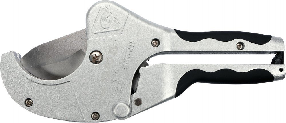 Instalatérské nůžky, pro řezání plastových trubek do průměru 64 mm. Materiál těla je robustní slitina hliníku, břit je z vytvrzené nerezové oceli 8Cr13 s tvrdostí HRC54. Postupný přenos síly je řešen ráčnovým mechanismem. S nůžkami je možné stříhat trubky z PVC / PP / PU / PE a další.