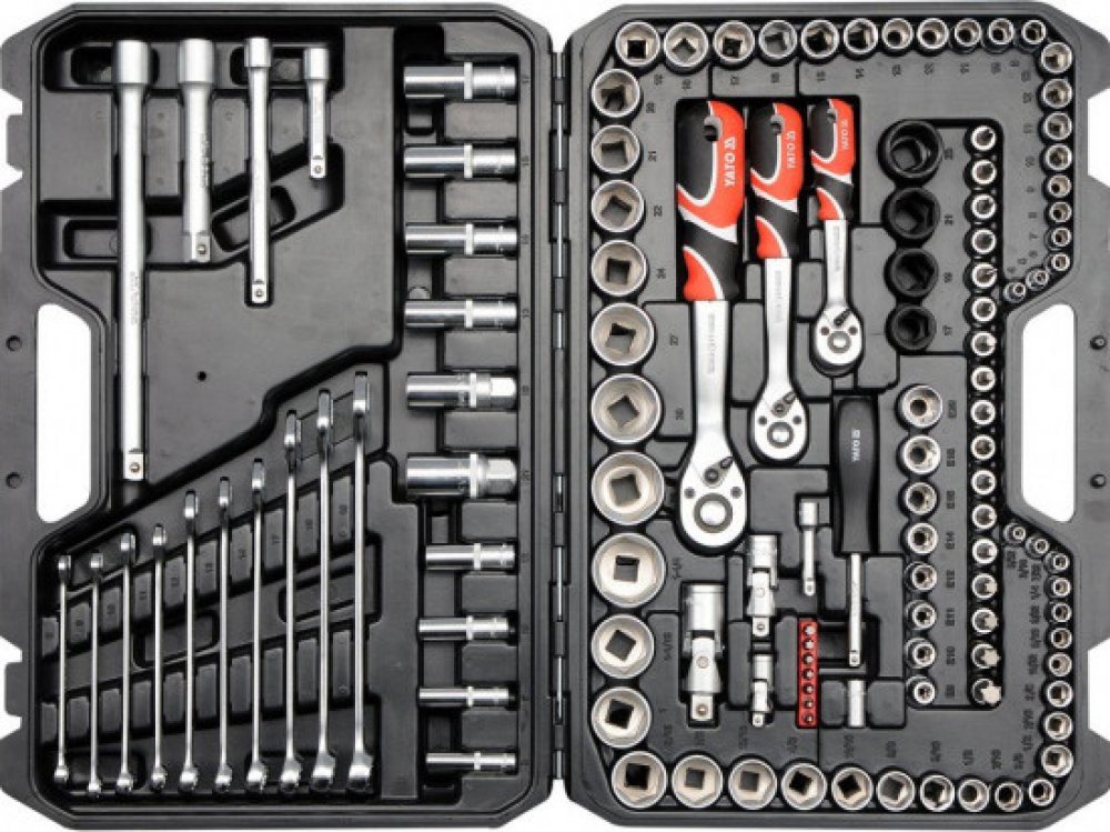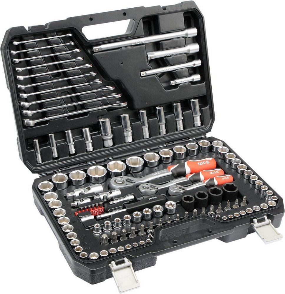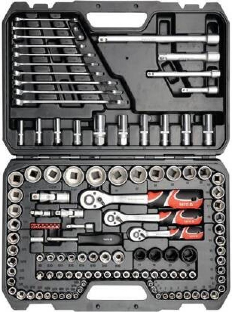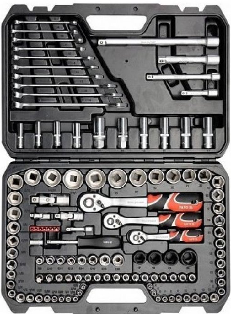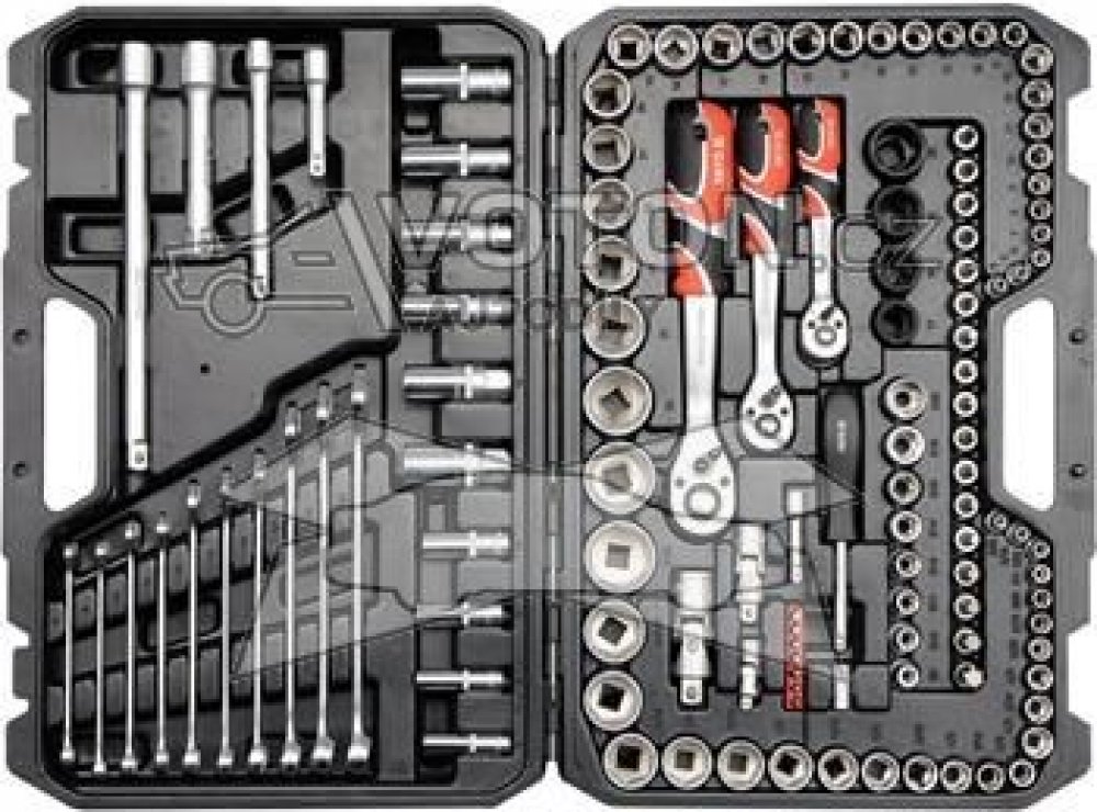 Gola sada 1/2", 3/8", 1/4" obsahuje 120ks: metrických a S.A.E. nástavců, prodlužovacích nástavců, ráčny s plastovou rukojetí a 72 zubým jemným chodem, kloubové nástavce, očkoploché klíče, nástavce s nejběžněji používanými bity a další příslušenství. Vyrobené z kvalitní chromvanadiové oceli CrMo440, CrV6150 a CrV50BV30, S2 s funkcí AS-DRIVE.