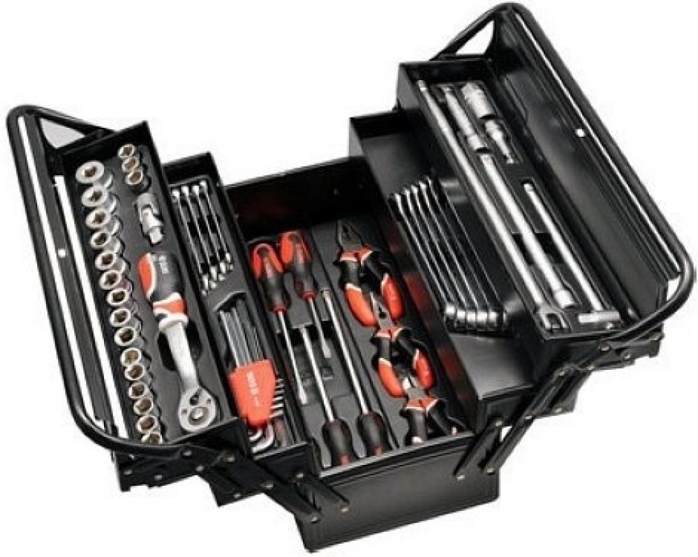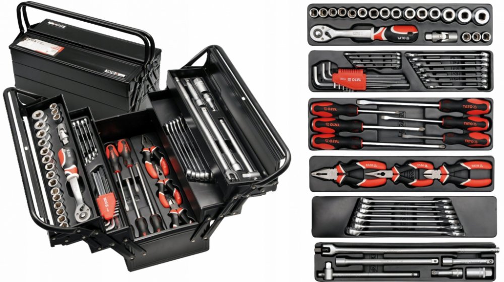 Sada základního nářadí v kovovém rozkládacím kufru vhodná pro údržbáře, nebo jako výbava do nákladního automobilu a podobných mechanizačních zařízení.