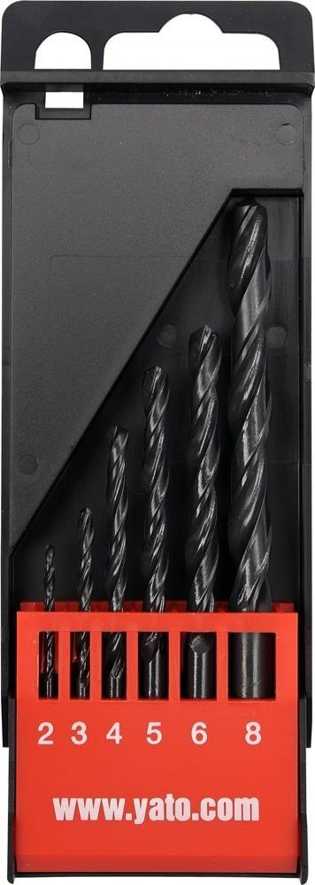Yato Sada vrtáků na kov 6 ks, YT-4460 Sada 6 ks vrtáků z rychlořezné oceli se zesíleným břitem a špičkami s ůhlem 118°. Sada je vhodná pro přesné vrtání oceli, litiny, kovů, plastů a je uložena v praktické krabičce. Technická data zhotovení HSS počet 6 ks průměry 2; 3; 4; 5; 6; 8 mm obal plastová krabička