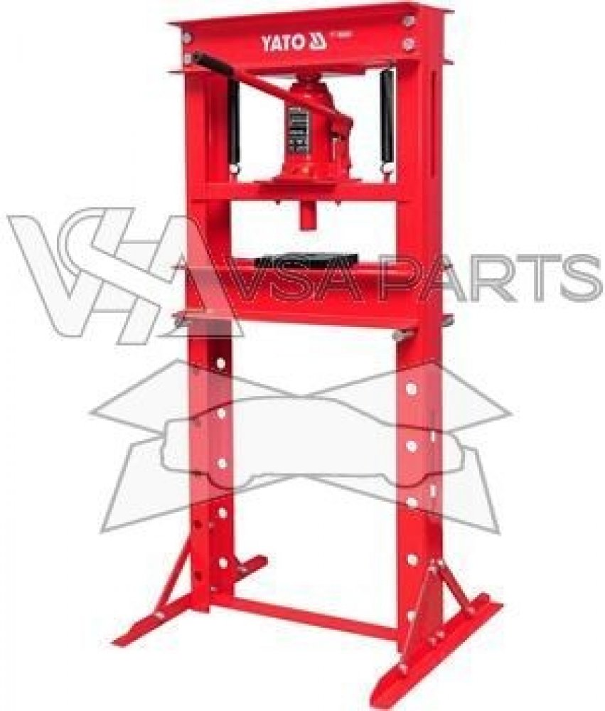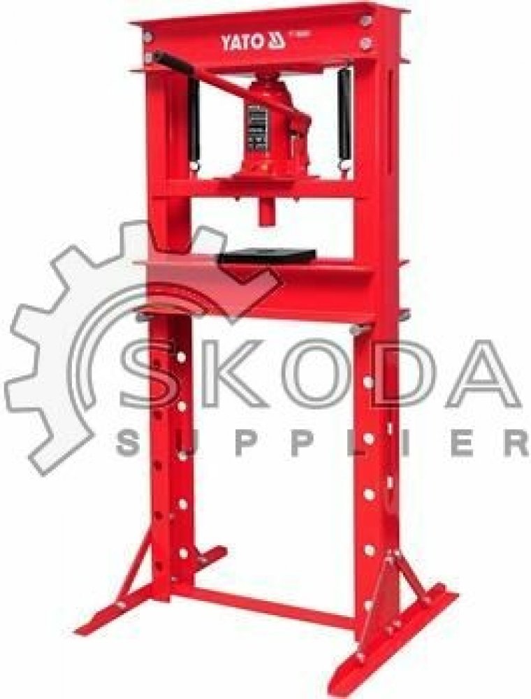 dílenský hydraulický lis Yato, maximální síla 20 t, rozsah práce 0–695 mm, rozměry 1410x700x550 mm, pracovní šířka 490 mm, lakovaná ocel, hmotnost 72 kg, určený pro autoservisy a výrobní provozy