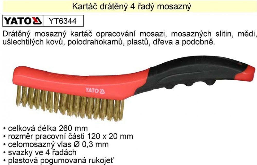 Drátěný mosazný kartáč opracování mosazi, mosazných slitin, mědi, ušlechtilých kovů, polodrahokamů, plastů, dřeva a podobně.
