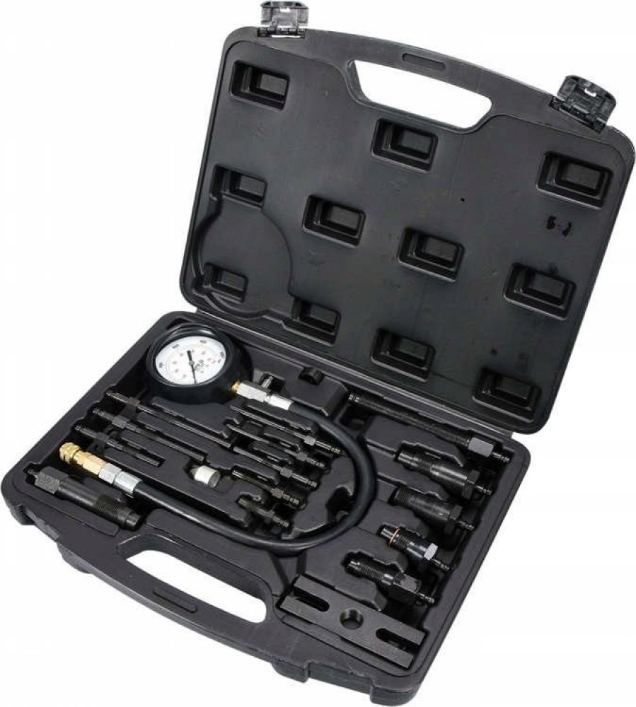 Sada pro měření komprese dieselových motorů s maximální hodnotou 70 bar. Sada obsahuje adaptéry pro připojení měřiče k většině vznětových motorů běžných značek automobilů. Souprava obsahuje manometr s maximálním rozsahem do 70 barů, prodlužovací adaptér, 9 adaptérů pro připojení přes žhavící svíčky motoru,4 adaptéry pro připojení k motoru přes vstřiky a montážní přípravek tvaru H. Vyrobeno z oceli...