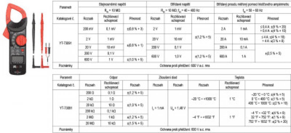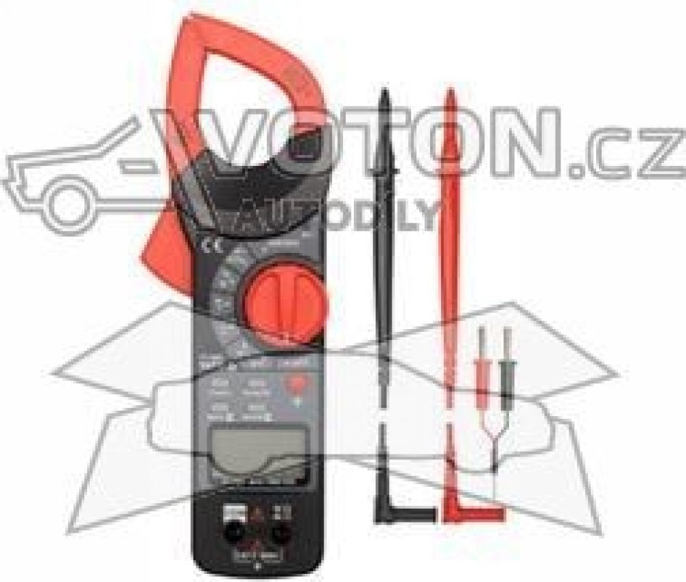 Kleštiny multimetru umožňují měření střídavého proudu (A) na principu indukce. To znamená měření mnohem vyšších proudů než u konvenčních multimetrů. Maximální průměr měřeného kabelu je 37 mm. Kromě měření střídavého proudu může přístroj, pomocí klasických kabelů s měřícími hroty, měřit stejnosměrné napětí, střídavé napětí, odpo...
