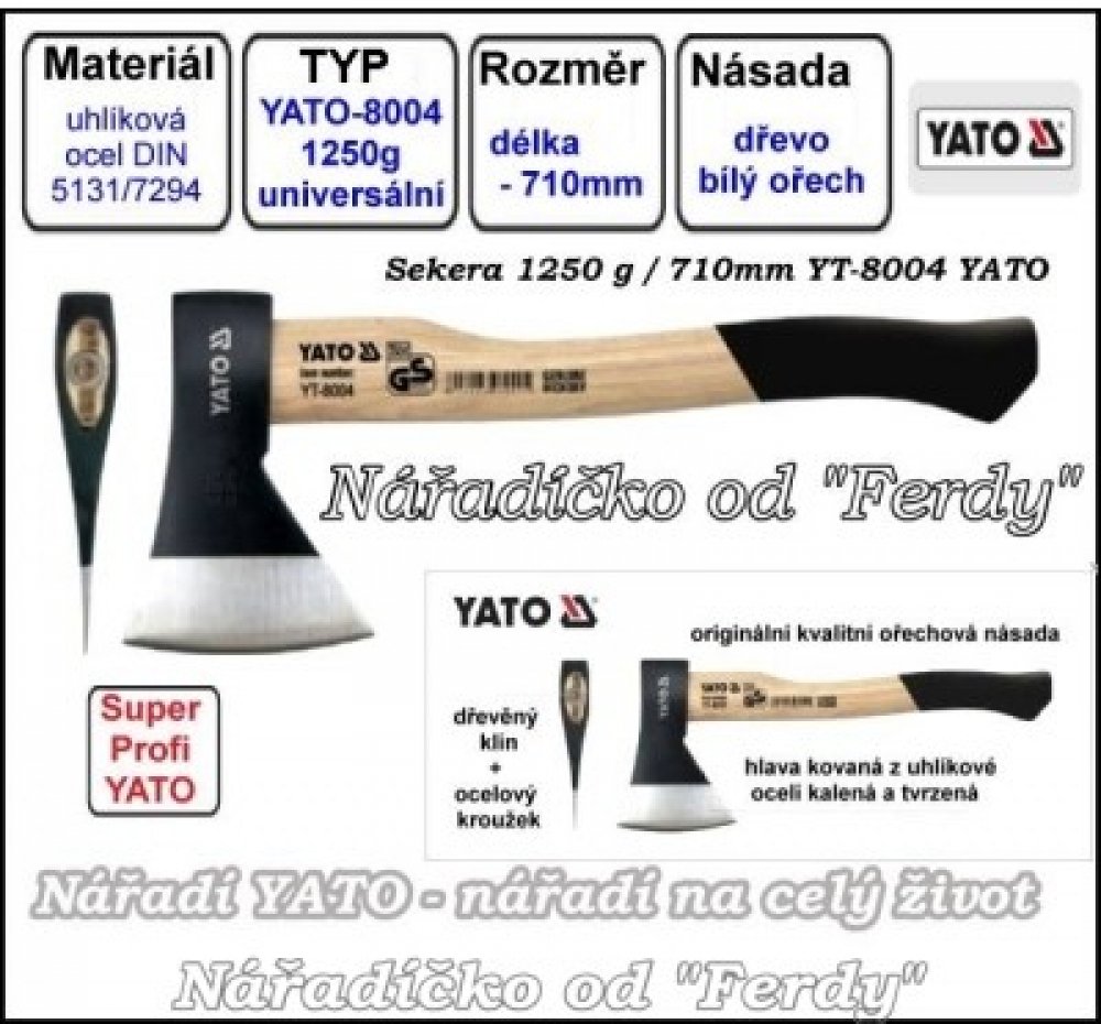 Yato Sekerka 1250 g s násadou z ořechového dřeva Yato Sekerka YT-8004 je vhodný ruční nástroj pro přesné štípání dřeva a další práce vyžadující spolehlivost a odolnost. Tento výrobek značky YATO kombinuje kvalitní materiály s pečlivým zpracováním. Popis produktu Sekerka má hlavu o hmotnosti 1250 g, která je vykována z kvalitní uhlíkaté oceli s kalením a temperováním, čímž je zajištěna vysoká odolnost vůči opotřebení a zachování ostří. Pro bezpečné uchycení hlavy na násadu slouží ocelový kroužek a dřevěný klín, což zabraňuje vyklánění při práci. Násada o délce 710 mm je vyrobená z bílého ořechu, materiálu ceněného pro svou pevnost, vysokou rázovou houževnatost a dlouhou životnost. Celková délka sekyry je 710 mm, což umožňuje pohodlnou manipulaci a efektivní údery. Sekerka splňuje normu DIN 5131. Použití Tato sekerka je vhodná pro kutily, řemeslníky i zahrádkáře, kteří potřebují nástroj pro štípání menších i středních kusů dřeva. Uplatní se při tesařských pracích, přípravě palivového dřeva nebo úpravě zahradních dřevin. Nástroj není určen pro sekání kovů nebo jiné tvrdé materiály mimo dřevo. Výhody Kvalitní uhlíkatá ocel zajišťuje dlouhodobou ostrost a pevnost ostří Odolná násada z bílého ořechu nabízí vysokou rázovou houževnatost Bezpečné uchycení hlavy pomocí klínu a ocelového kroužku zabraňuje vyklánění Klíčové vlastnosti typ: sekyra model: YT-8004 značka / výrobce: YATO materiál: hlava: uhlíkatá ocel; násada: bílý ořech klíčové provozní parametry: váha ostří 1250 g rozměry a hmotnost: délka 710 mm povrch / úprava: kalená a temperovaná hlava obsah sady: 1× sekyra Yato Sekerka 1250 g s násadou z ořechového dřeva další technické parametry: norma DIN 5131 FAQ Jaký je materiál násady sekyry YT-8004? Násada je vyrobena z přírodního bílého ořechu, který nabízí vysokou pevnost a houževnatost. Je hlava sekyry kalená? Ano, hlava je vyrobena z uhlíkaté oceli, která byla kalená a temperovaná pro lepší životnost a ostrost. Na co je vhodná tato sekyra? Sekyra je určena především pro štípání dřeva a podobné dřevěné práce, není vhodná k sekání jiných materiálů.