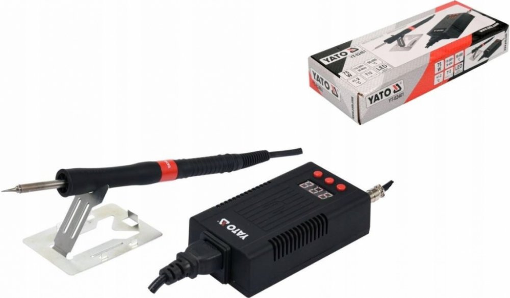 Yato Pájecí stanice s LED displejem 75W, YT-82461 Pájecí stanice YT-82461 s digitálním LED displejem, regulací teploty a funkcí kalibrace teploty je navržena pro práci s hrotem s vestavěným ohřívačem. Pájecí hroty typu T12 jsou kombinací odporového drátu zalitého v keramice, teplotního senzoru a vysoce kvalitního pájecího hrotu. Integrovaný design hrotu umožňuje rychlé zahřátí a velmi rychlou stab...