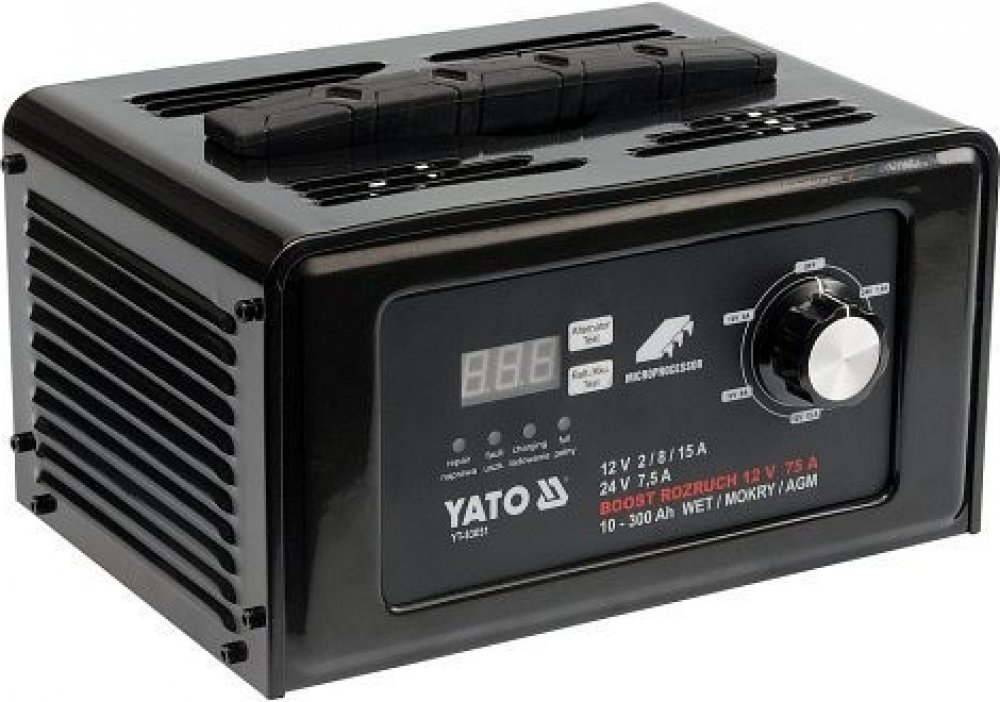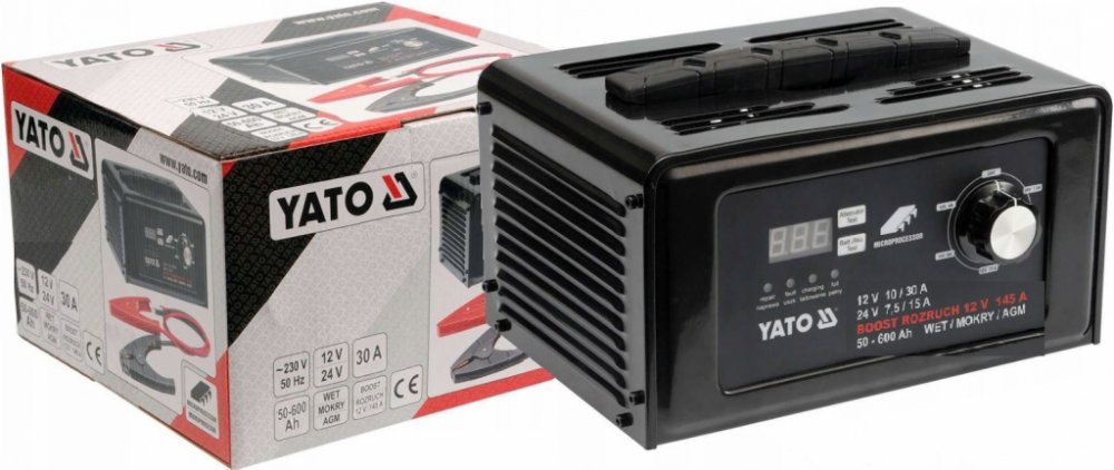 Mikroprocesorová nabíječka akumulátorů 12/24V s napájením 230V s funkcí Boost (Starter), umožňující nastartovat vozidlo s vybitou baterií tak, jako by bylo startováno pomocí startovacích kabelů z jiného vozidla.
