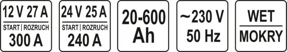- Nabíjecí proud (napětový rozsah) 12V: 7,5/16/27 A