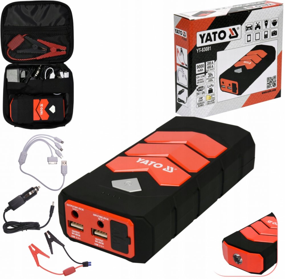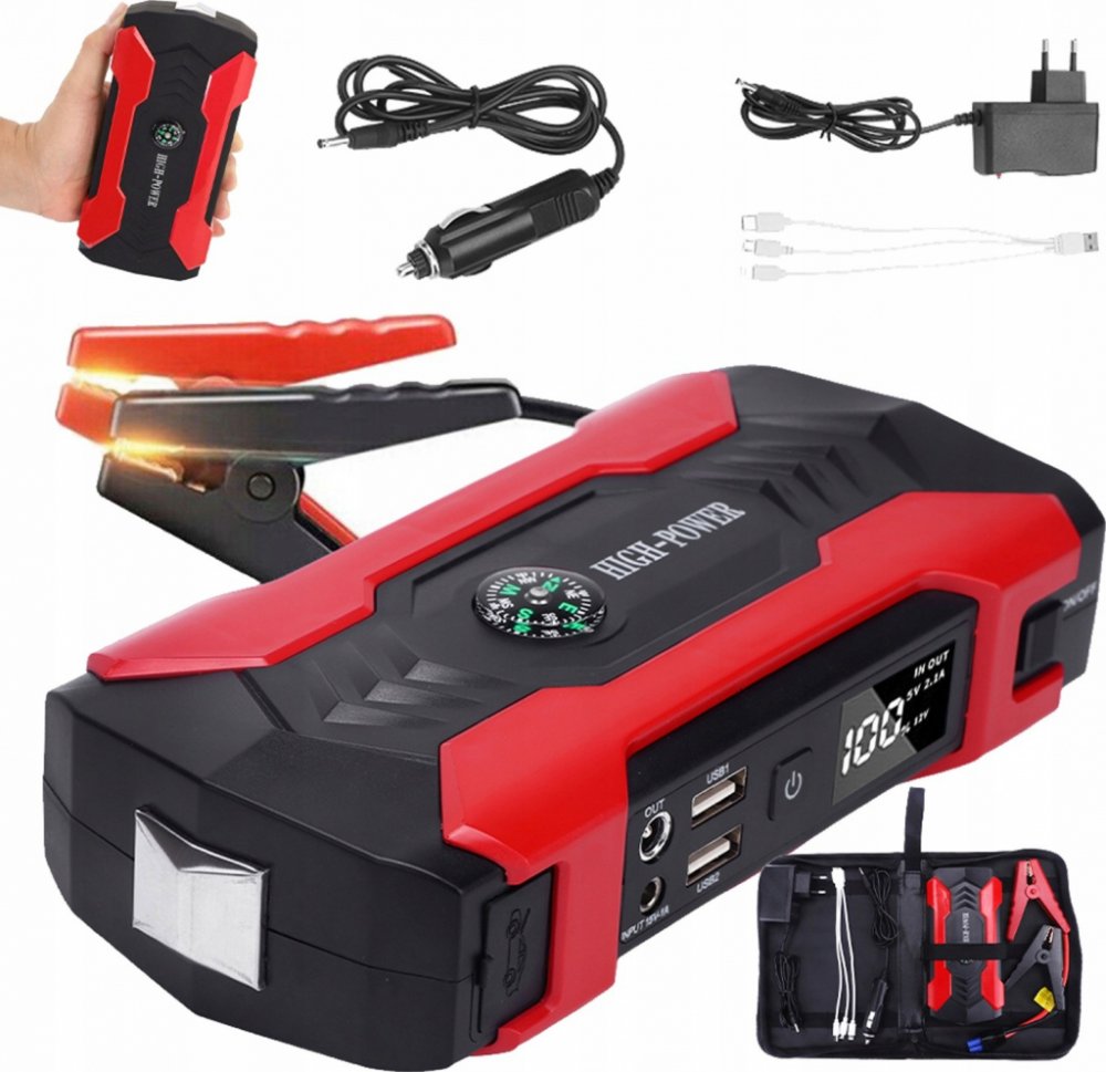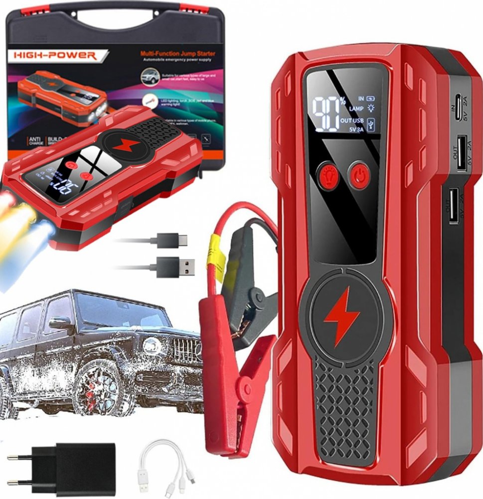 Kompaktní mobilní zařízení s kapacitou 9000mAh, vhodné pro nouzové nastartování vozidla a napájení přenosných zařízení.