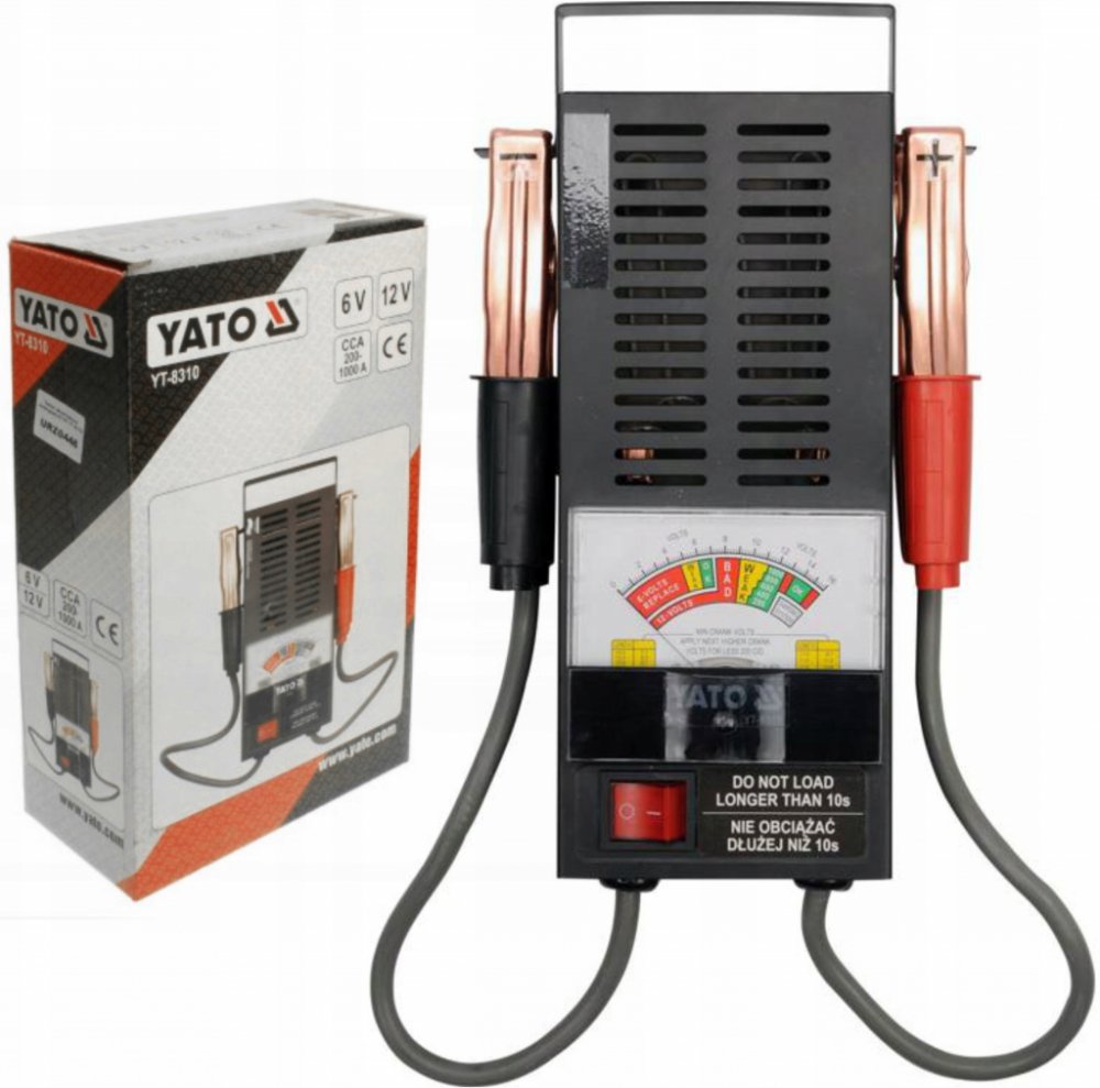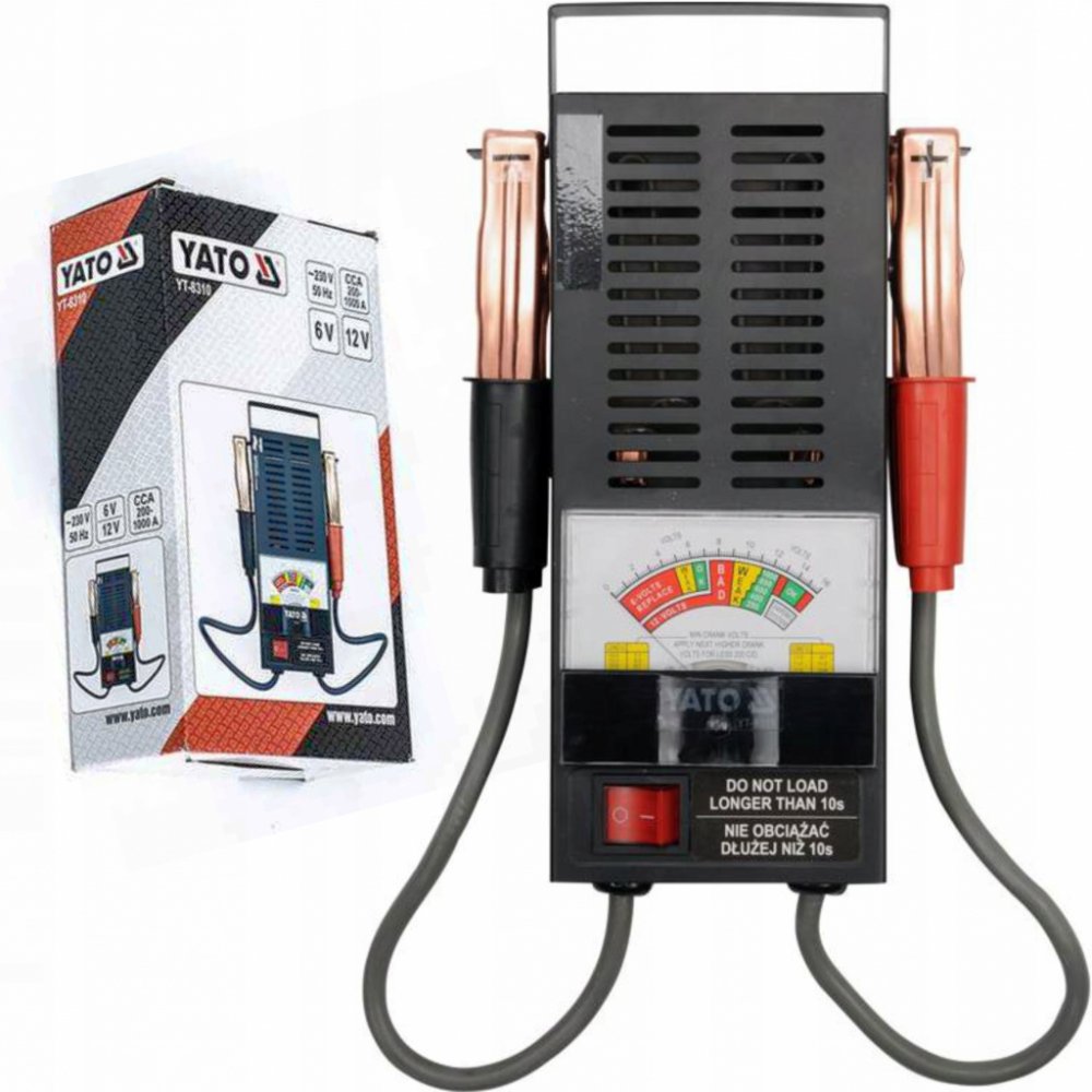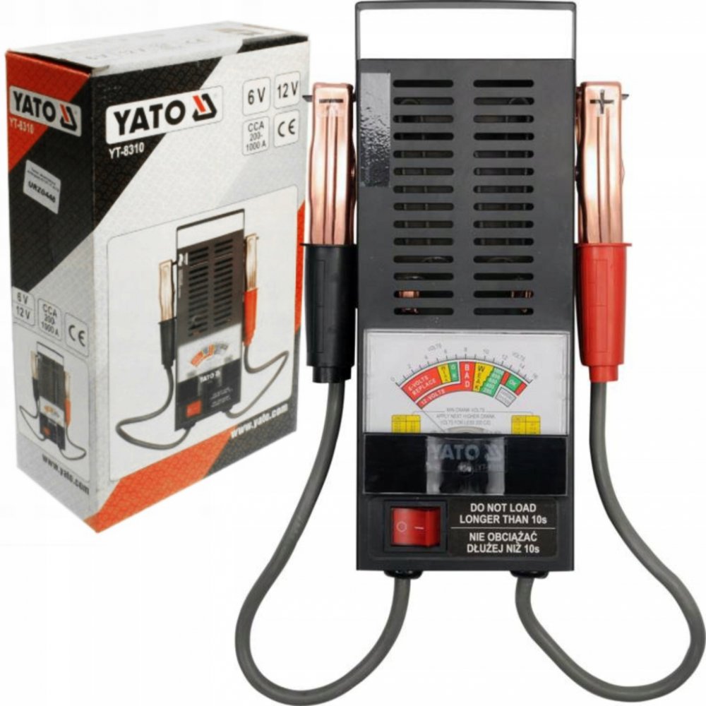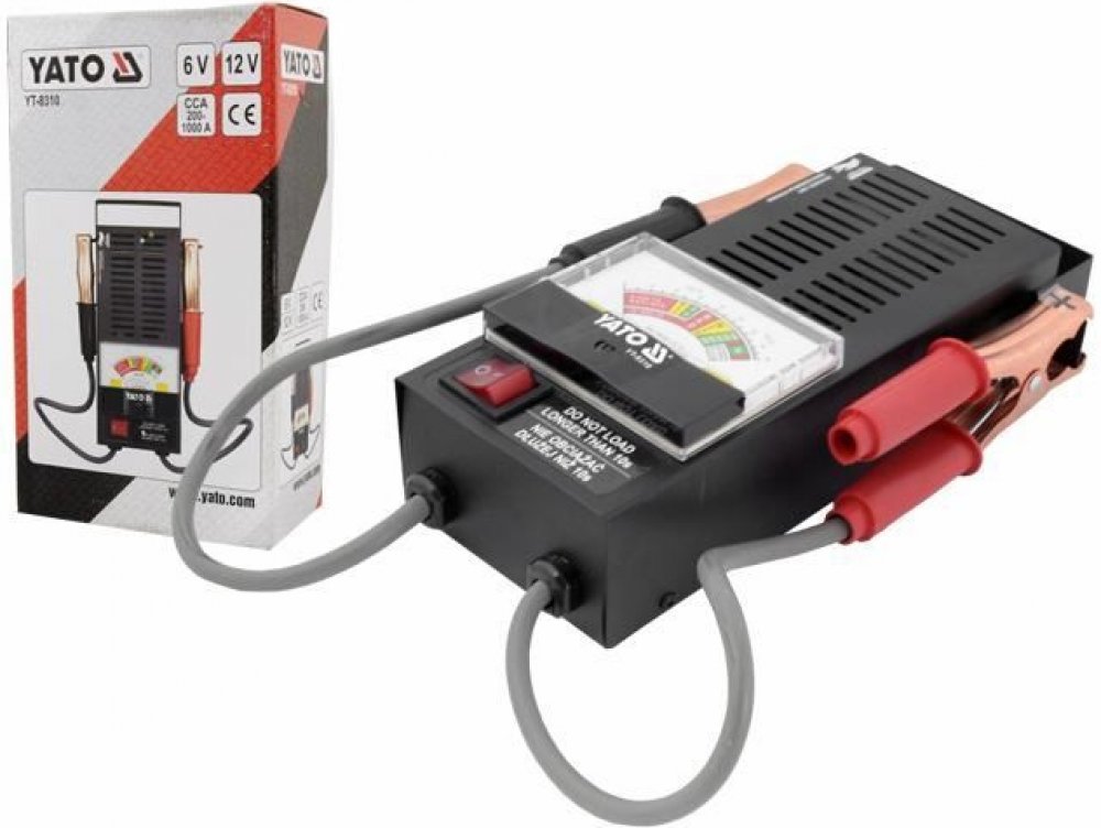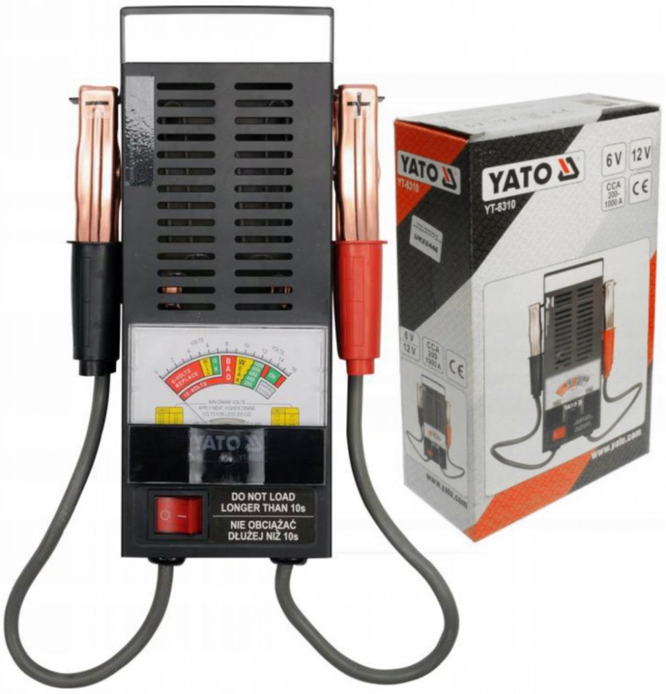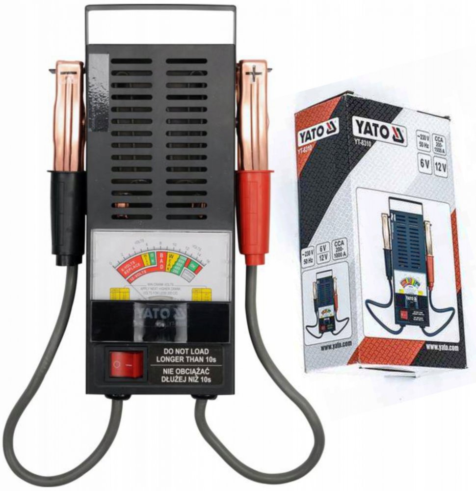 Analogový tester akumulátorů YT-8310 je určen k rychlému a jednoduchému testování stavu autobaterií. Tento tester je vhodný pro všechny 6 V a 12 V autobaterie typu WET. Díky ochraně proti zkratu a přebití akumulátoru zajišťuje bezpečné používání. Testování je snadné – stačí připojit přístroj k autobaterii pomocí klasických svorek, aktivovat jej tlačítkem a výsledky okamžitě odečíst z přehledného analogového ukazatele.