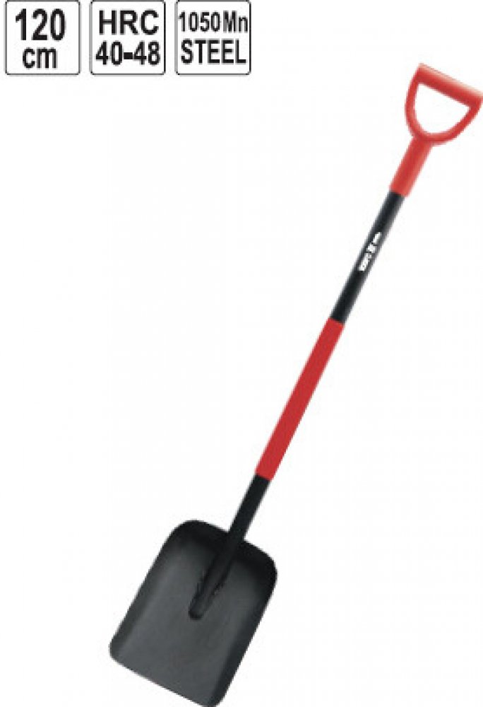 kovová rukojeť, pogumovaná násada, délka 120 cm, ergonomický tvar dy, vhodná na písek a štěrk, vyvážená konstrukce