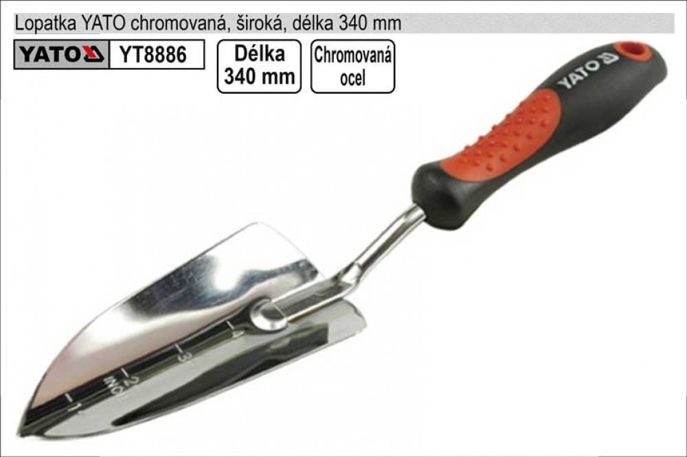 Lopatka s čepelí z odolné, korozivzdorné chromové oceli o rozměrech 7 x 15 cm s měrkami hloubky.