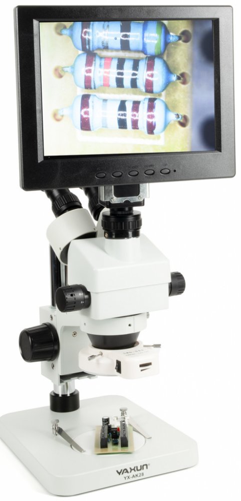 Binokulární (stereoskopický) mikroskop s LCD displayem Yaxun YX-AK28 je profesionální stereoskopický mikroskop s otočnou 360° hlavou s CCD snímačem, LCD obrazovkou a plynule nastavitelným zvětšením 7x - 45x. Hlava mikroskopu je výškově nastavitelná a umožňuje pozorování vyšších předmětů. Výsledné zvětšení se skládá z okulárů WF10X s pevným zvětšením 10x a plynule nastavitelným objektivem - od 0.7x...