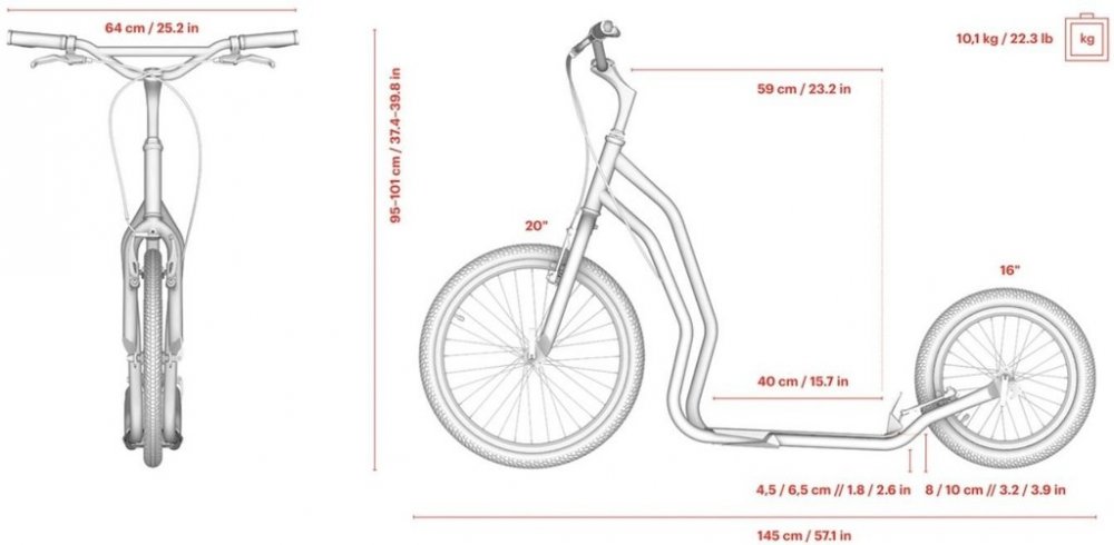 Koloběžka s nastavitelnou výškou řídítek, přední i zadní brzda, nafukovací kola pro náročnější terén, nízká hmotnost, vysoká nosnost.