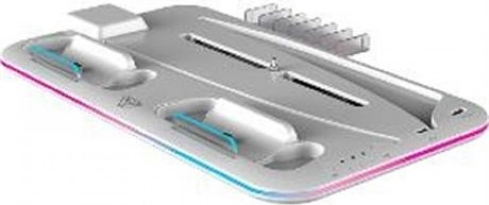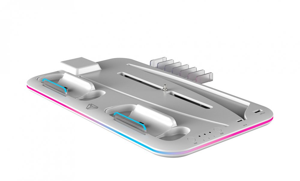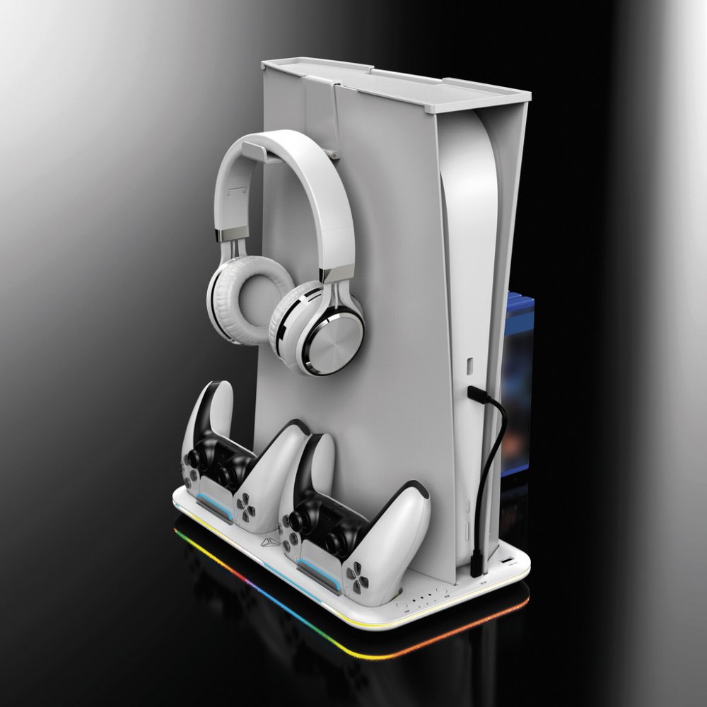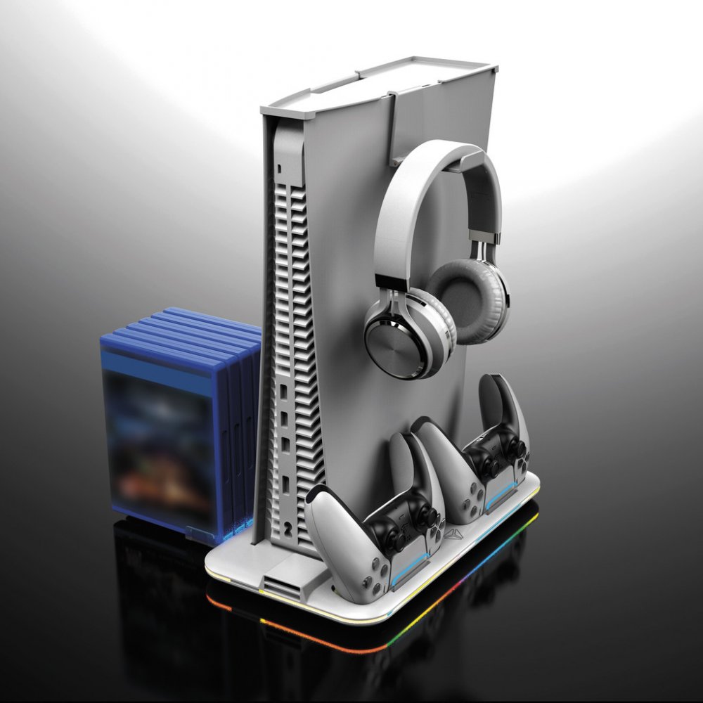 Dokovací nabíjecí stanice HOMEBASE pro konzoli PS5. Ve stanici se nachází nastavitelný ventilátor pro aktivní chlazení konzole. Stanice umí nabíjet až dva PS5 ovladače současně. Decentní podsvícení stanice. Světelná indikace nabíjení. Součástí stanice také háček na sluchátka a prachový kryt na vrchní část konzole, na pravé straně pak přihrádka až na šest disků s hrami. Vstup: DC 5 V/3 A Výstup: DC...