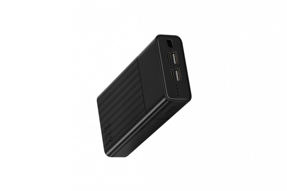 Kompaktní power banka s kapacitou 20 000mAh a duálním USB výstupem s maximálním nabíjecím proudem 2A vhodná pro nabíjení chytrých zařízení.