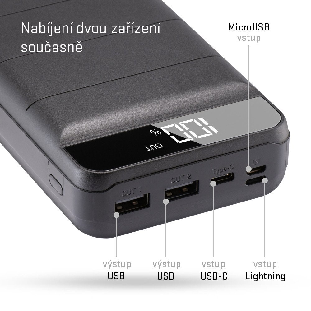 Díky dvojici USB výstupních portů s 2A nabíjecím proudem můžete nabíjet až dvě zařízení současně.