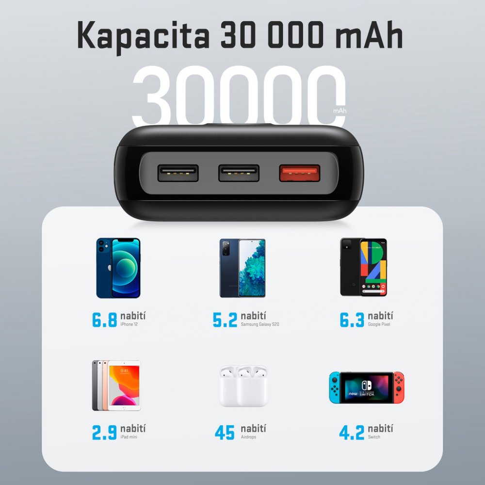 Velkokapacitní power banka s LCD displejem a USB C portem vhodná pro nabíjení chytrých zařízení výstupním výkonem až 20W. 30 000mAh power banka je vybavena technologii rychlého nabíjení Power Delivery 20W a prostřednictvím USB-C případně 3x USB A portu můžete plnohodnotně nabíjet Váš telefon nebo tablet. USB ...