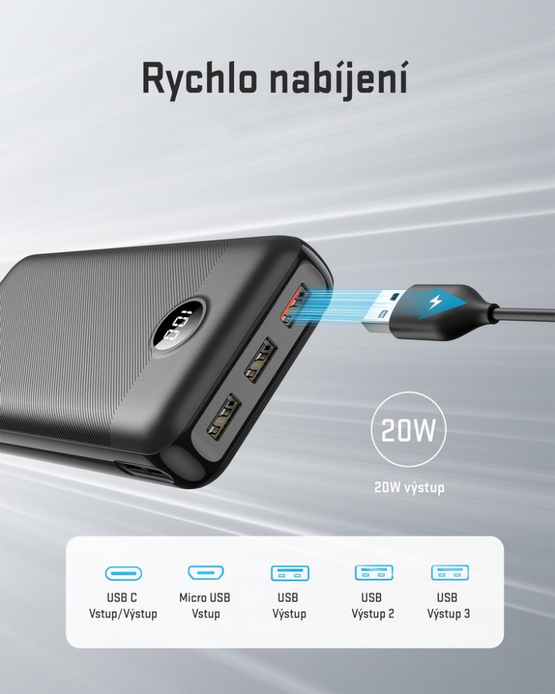 Velkokapacitní power banka s LCD displejem a USB C portem vhodná pro nabíjení chytrých zařízení výstupním výkonem až 20W. 30 000mAh power banka je vybavena technologii rychlého nabíjení Power Delivery 20W a prostřednictvím USB-C případně 3x USB A portu můžete plnohodnotně nabíjet Váš telefon nebo tablet. USB C port slouží jako vstup a výstup. Rychlé nabíjení PD18W lze využít i pro nabíjení samotné power banky. Výsupní port USB A podporuje technologii rychlého nabíjení QC 2.0 a QC 3.0, které je 4x rychlejší než běžné nabíjení. Výstupní výkon je regulován pomocí inteligentní správy napájení. Power banka komunikuje s nabíjeným zařízením a pozná jestli se jedná o smartphone nebo tablet. Díky tomu je Vaše zařízení nabíjeno optimálním výkonem. LCD displej zobrazí aktuální stav kapacity baterie power banky a aktivujete ho pomocí bočního zapínacího tlačítka.
