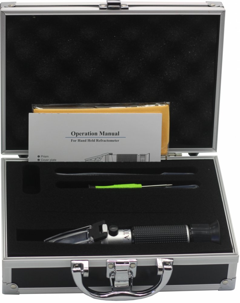 Obsah balení: Refraktometr, šroubovák pro kalibraci, pipeta, hadřík, hliníkový kufřík, návod, kalibrační set.