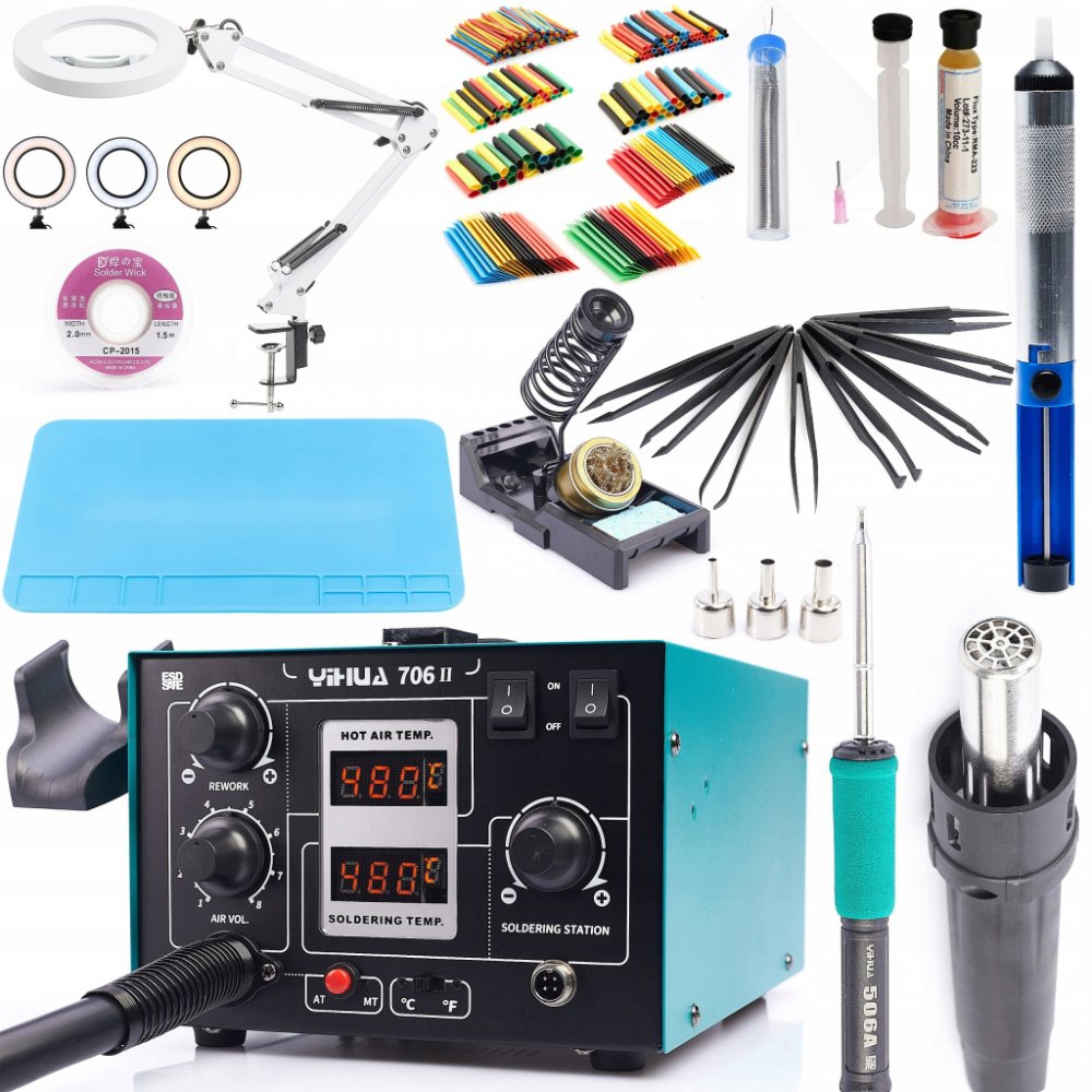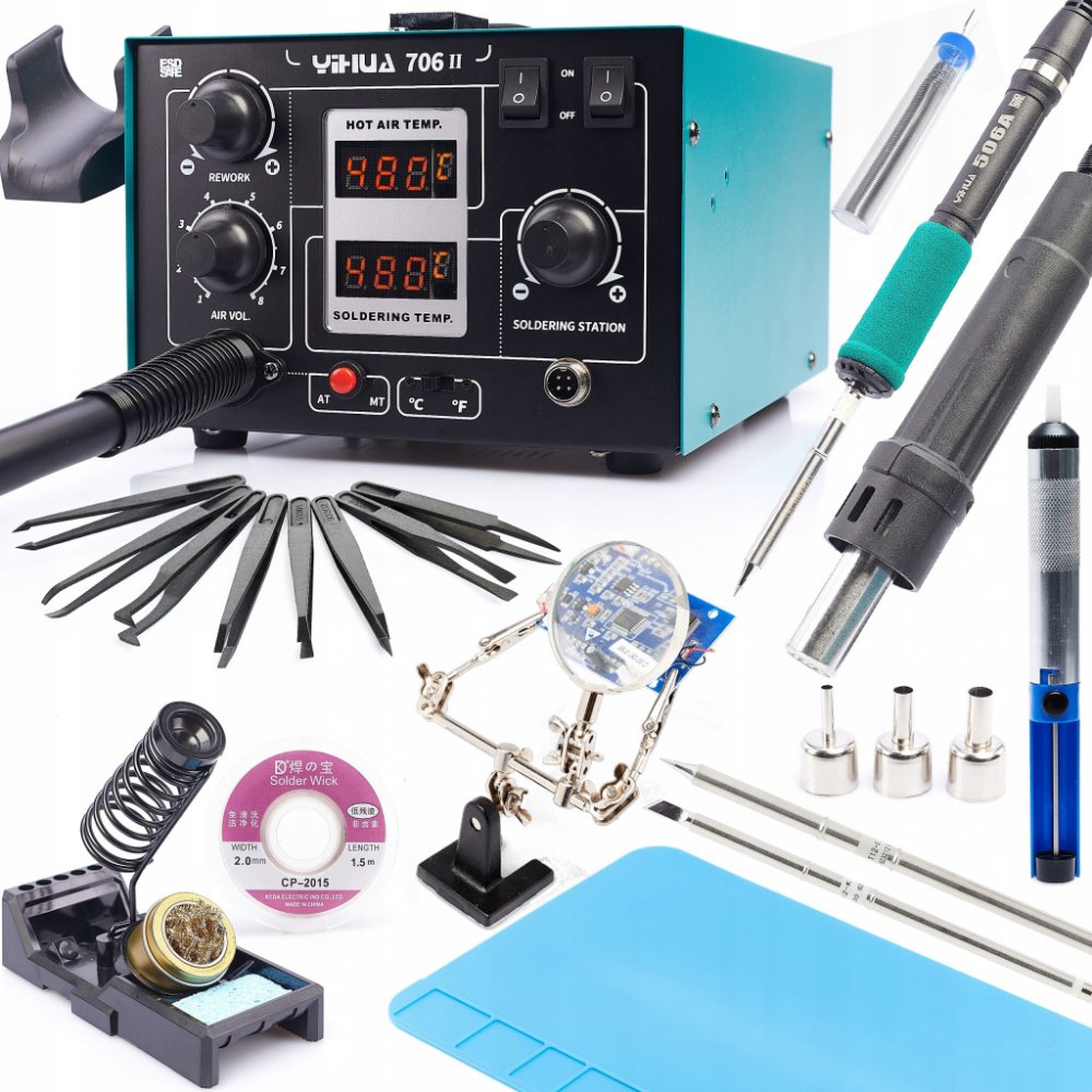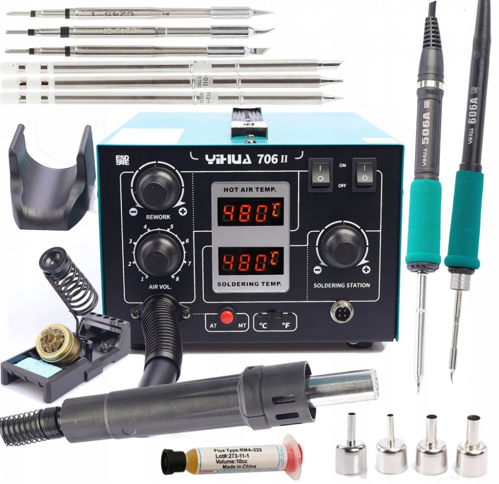Sada pájecí stanice 2v1 Hot-Air 706 II systém T12 Yihua se 4 přídavnými tryskami + sada příslušenství