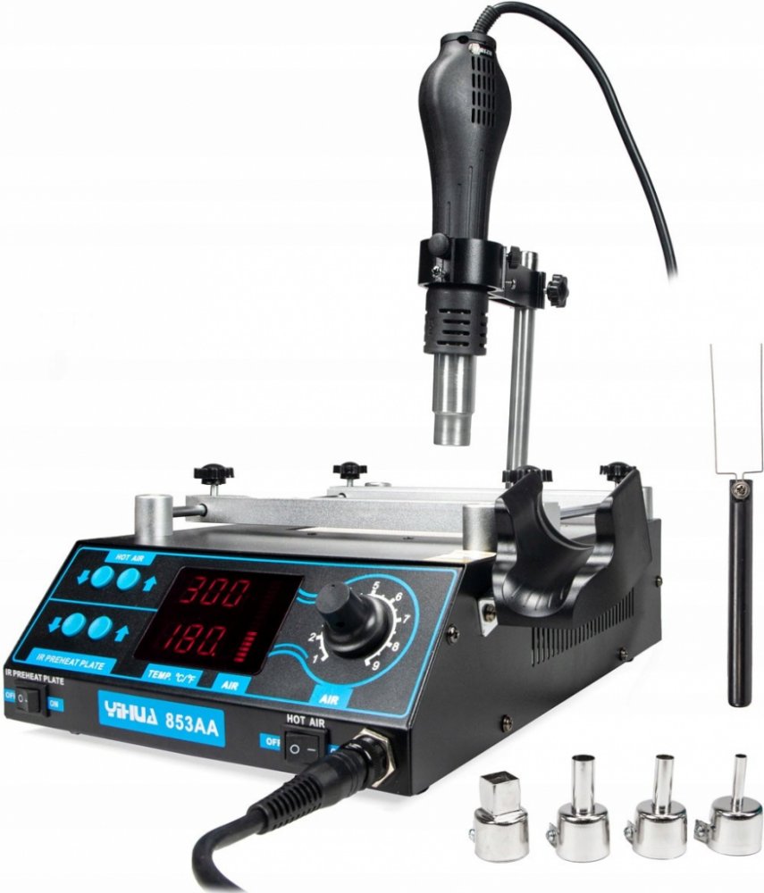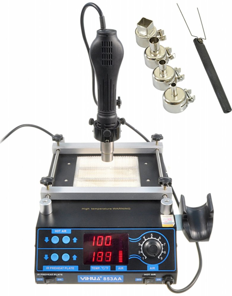 YIHUA 853AA vyplňuje mezeru v zařízeních pro demontáž z malých desek, jako jsou např. telefony, navigace systémů BGA, QFP, PLCC nebo jiných drobných SMD prvků. Díky kombinaci ohřívače s hotair páječkou na stativu je tato práce pohodlná a bezpečná, protože servisní technik má obě ruce volné při montáži a je bezpečná.