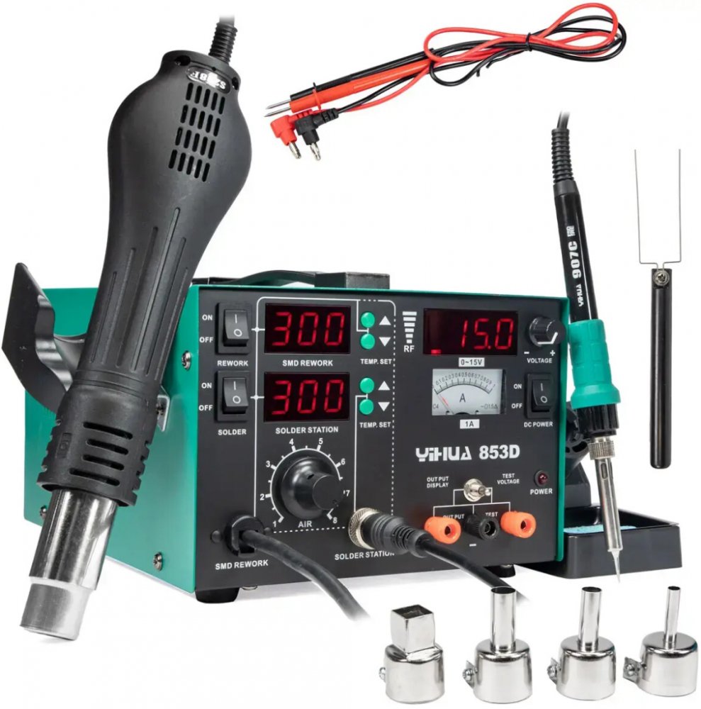 YIHUA 853D 1A RF je kombinovaná horkovzdušná pájecí stanice s mikropáječkou a laboratorním zdrojem s RF testerem. Všechny tři části stanice jsou na sobě nezávislé a lze je provozovat samostatně. Teplotu horkého vzduchu i mikropáječky lze nastavit digitálně pomocí tlačítek, nastavená a aktuální teplota se zobrazuje na LED displeji. Výkon ventilátoru je ovládán analogově pomocí otočného potenciometr...