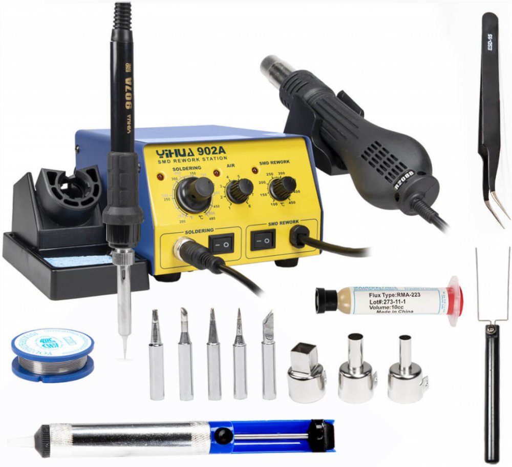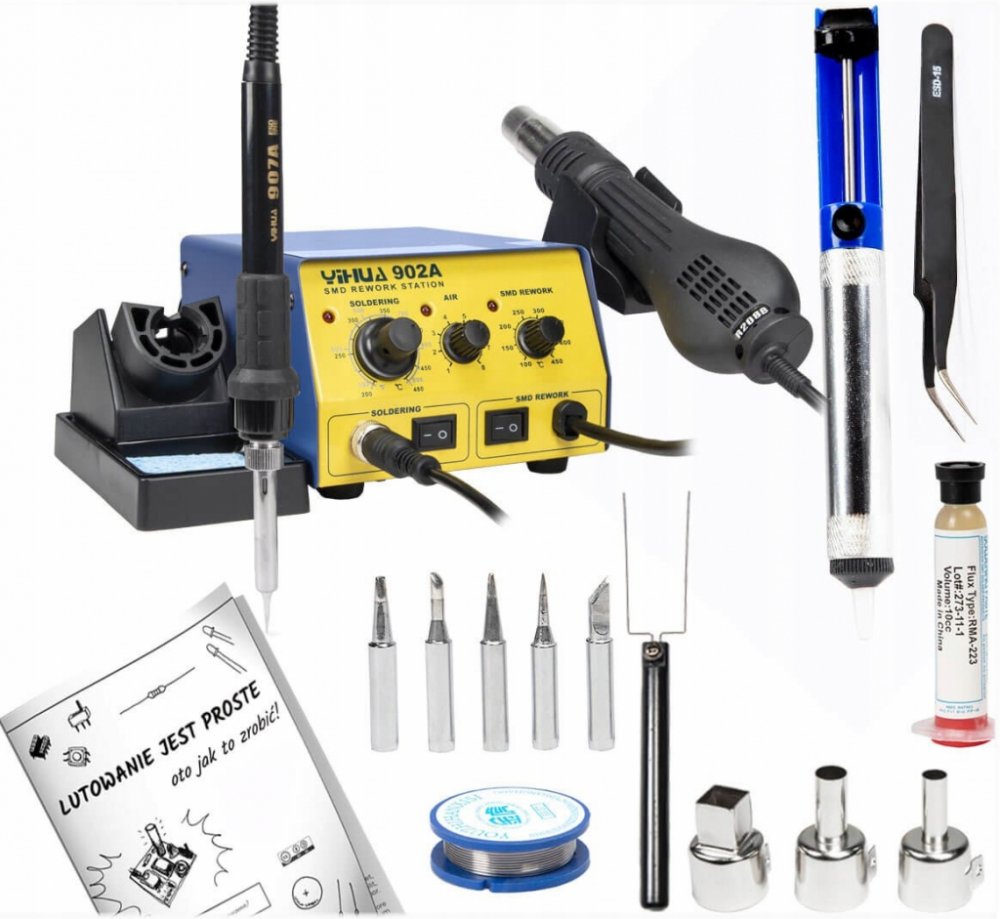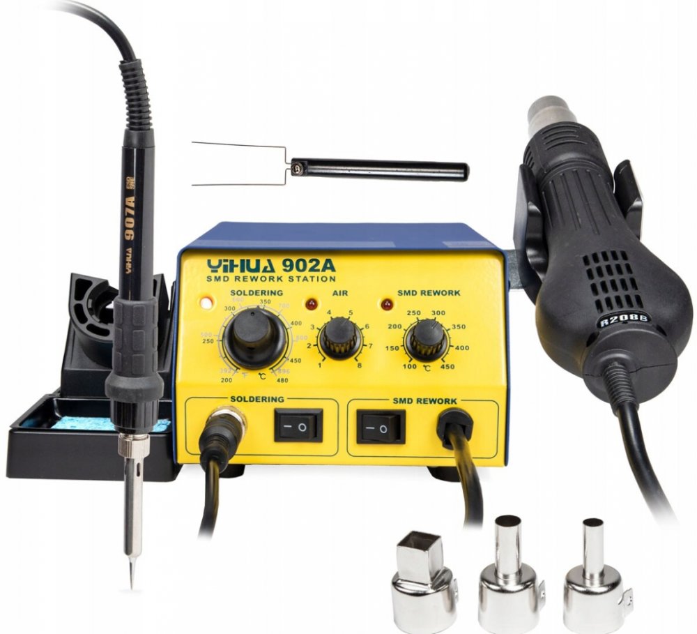 Yihua 902A je všestranná pájecí stanice typu 2v1, která spojuje hot-air pažbu a klasickou hrotovou páječku v jednom praktickém provedení. Byla navržena pro uživatele, kteří oceňují výkon, spolehlivost a pohodlí při práci – jak v profesionálním servisu, tak v domácí dílně.